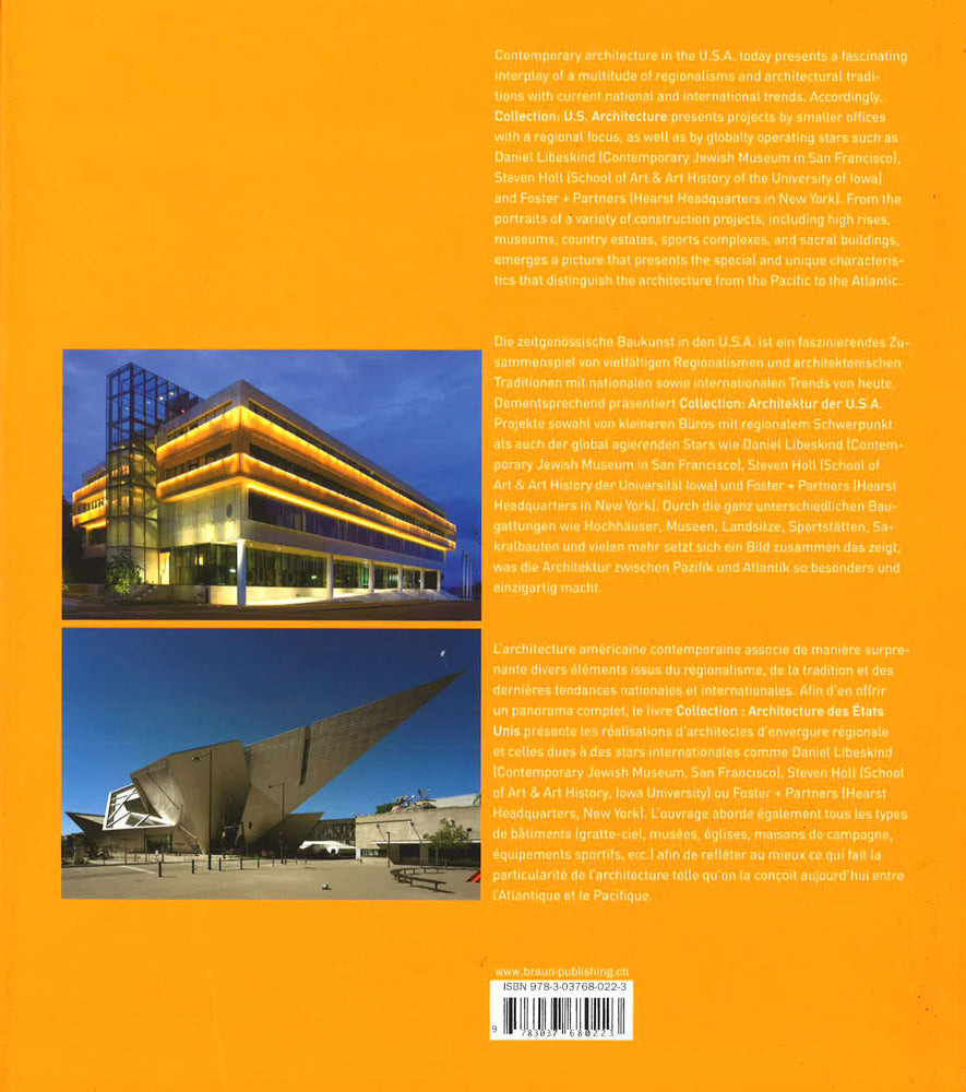 American architecture has created a symbol for itself in the skyscraper. This work demonstrates how architecture in the USA has moved on past the skyscraper. American architecture has created a symbol for itself in the skyscraper. It is a typology that seems to shout "Yes we can!", and the superpower lives by these words to this day. As a little boy, President Barack Obama dreamed of becoming an ar-chitect. Now, those who have fulfilled this dream demonstrate how architecture in the USA has moved on past the skyscraper. The generously illustrated volume from the trilingual Collection series reflects the complete bandwidth of the architecture of this vast nation. Top contemporary projects completed in the last few years have been selected, representing many different categories, including residential houses, office buildings and government buildings as well as sports facilities, research laboratories and museums.