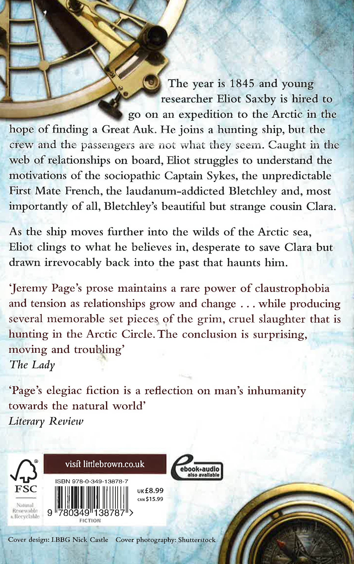 The year is 1845 and young researcher Eliot Saxby is paid to go on an expedition to the Arctic in the hope of finding remains of the by now extinct Great Auk. He joins a regular hunting ship, but the crew and the passengers are not what they seem. Caught in the web of relationships on board, Eliot struggles to understand the motivations of the sociopathic, embroidery-loving Captain Sykes, the silent First Mate French, the flamboyant laudanum-addicted Bletchley and, most importantly of all, Bletchley's beautiful but strange 'cousin' Clara. As the ship moves further and further into the wilds of the Arctic sea, Eliot clings to what he believes in, desperate to save Clara but drawn irrevocably back into the past that haunts him.