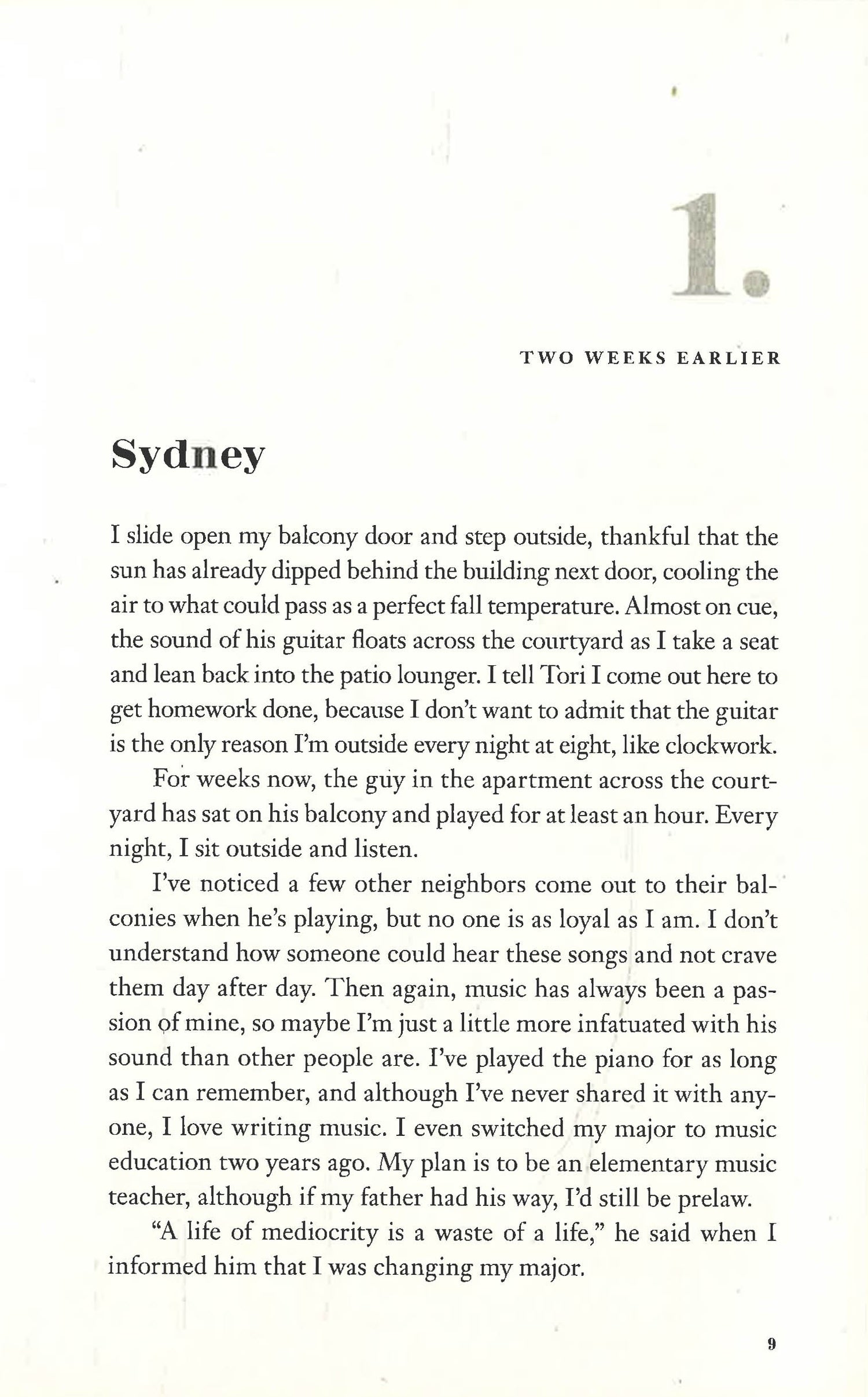 Soon, Sydney finds herself captivated by her mysterious and attractive neighbor, Ridge. She can't take her eyes off him or stop listening to the passionate way he plays his guitar every evening out on his balcony. And there’s something about Sydney that Ridge can’t ignore, either. They soon find themselves needing each other in more ways than one.