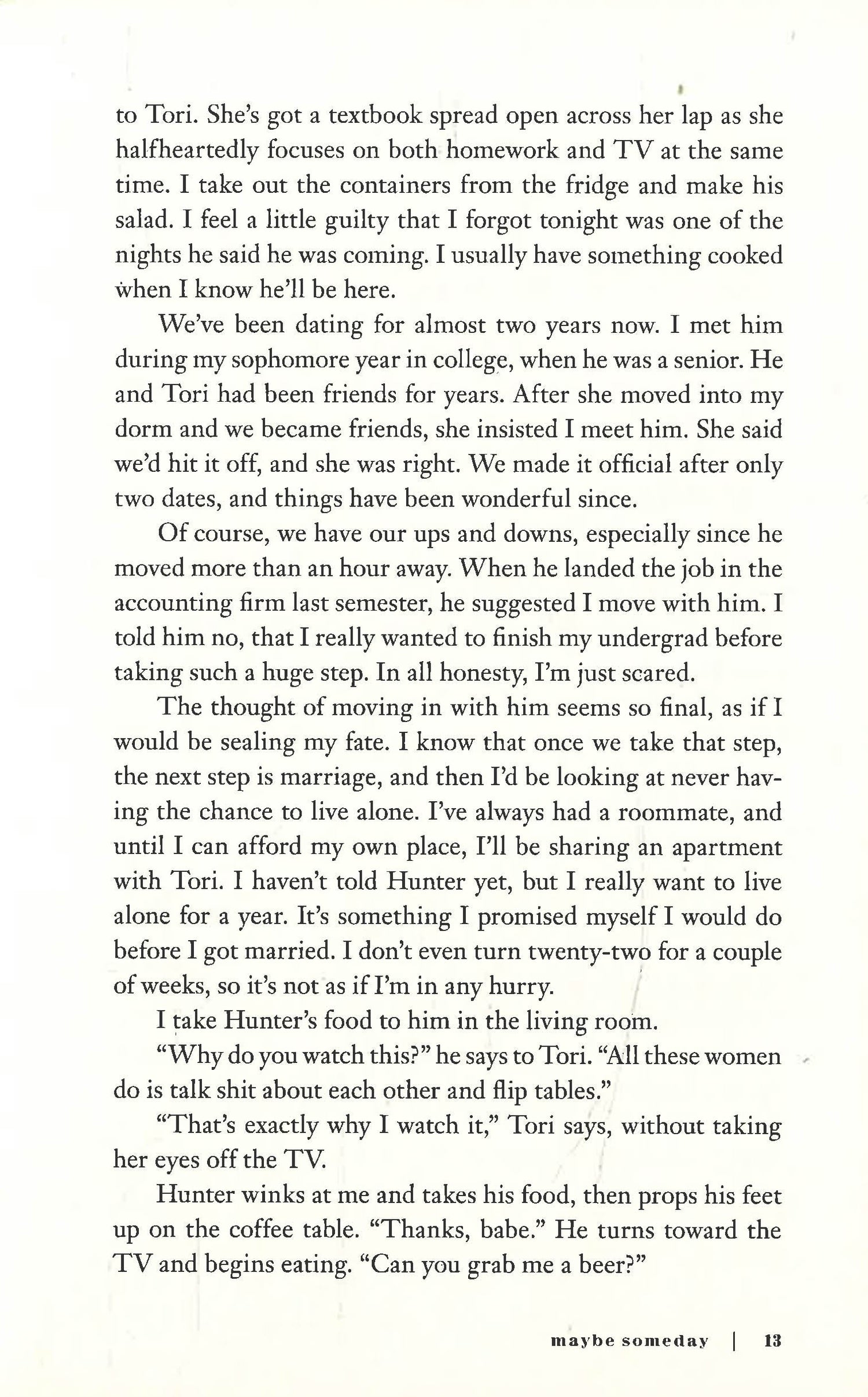 At twenty-two years old, Sydney is enjoying a great life: She’s in college, working a steady job, in love with her wonderful boyfriend, Hunter, and rooming with her best friend, Tori. But everything changes when she discovers that Hunter is cheating on her—and she’s forced to decide what her next move should be.