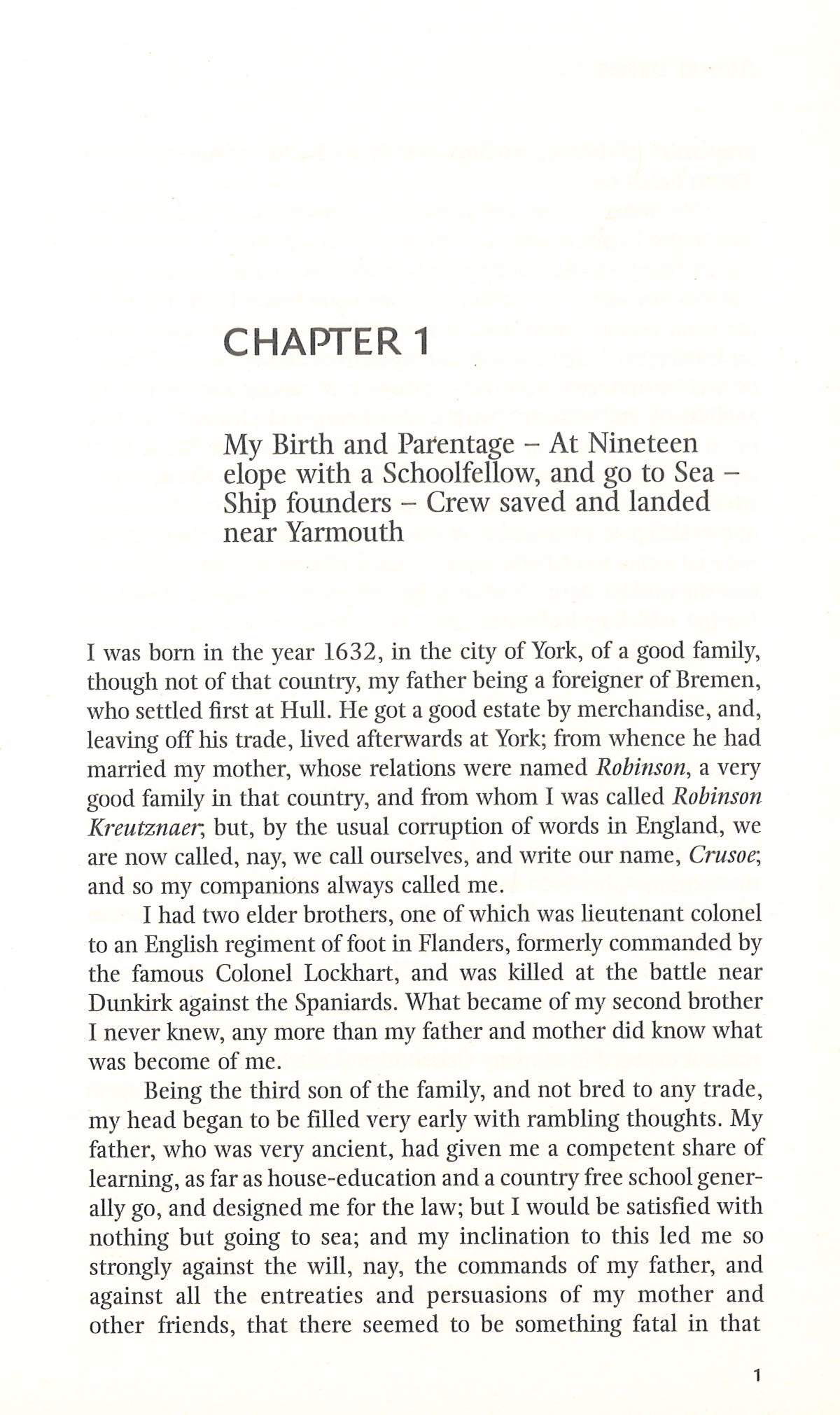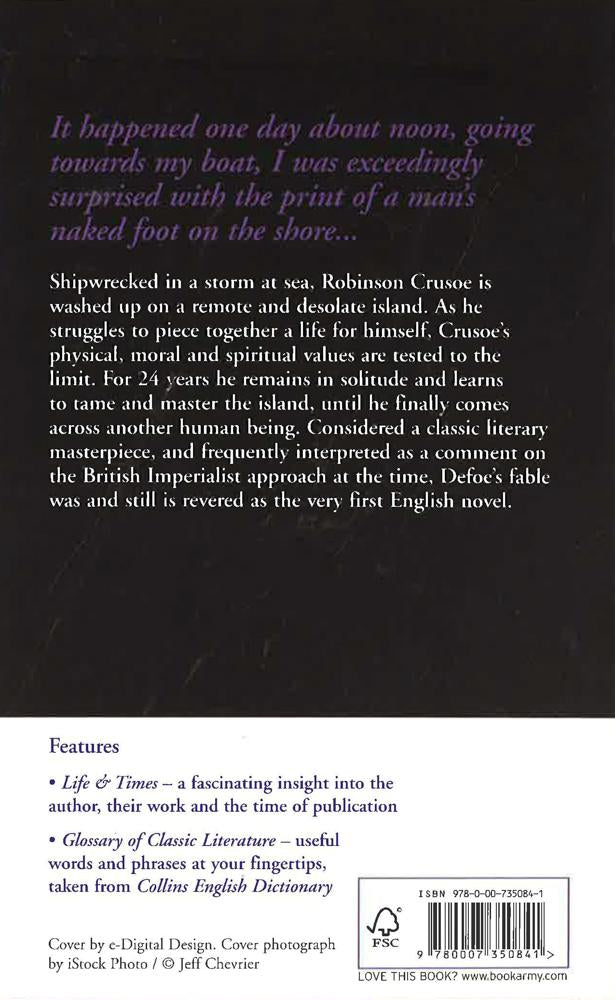 HarperCollins is proud to present its new range of best-loved, essential classics. 'It happen'd one Day about Noon going towards my Boat, I was exceedingly surpriz'd with the Print of a Man's naked Foot on the Shore.' Shipwrecked in a storm at sea, Robinson Crusoe is washed up on a remote and desolate island. As he struggles to piece together a life for himself, Crusoe's physical, moral and spiritual values are tested to the limit. For 24 years he remains in solitude and learns to tame and master the island, until he finally comes across another human being. Considered a classic literary masterpiece, and frequently interpreted as a comment on the British Imperialist approach at the time, Defoe's fable was and still is revered as the very first English novel.