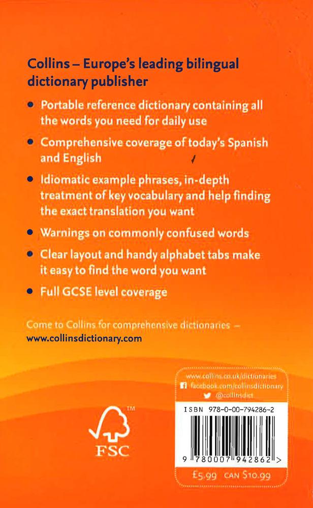 Nice handy sized small paperback bilingual dictionary from Europe's leading dictionary publisher. This portable reference contains all the words you need for daily use in today's Spanish and English languages. There are idiomatic example phrases, in-depth treatment of key vocabulary, and help finding the exact translation you want. There are warnings on commonly confused words and the very clear layout and handy alphabet tabs make it very easy to use from English to Spanish and Spanish to English. For students, full GCSE level coverage and also super handy for holiday or work.