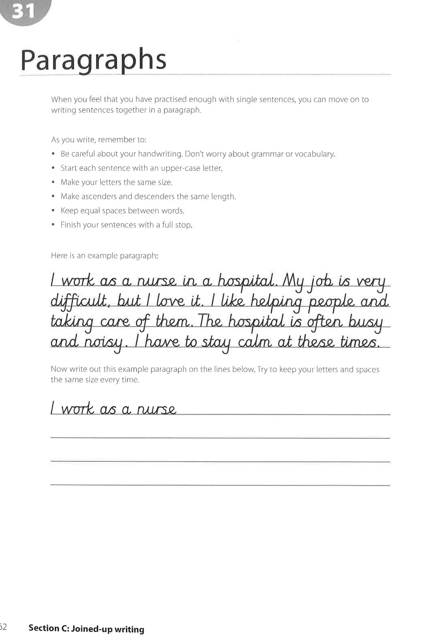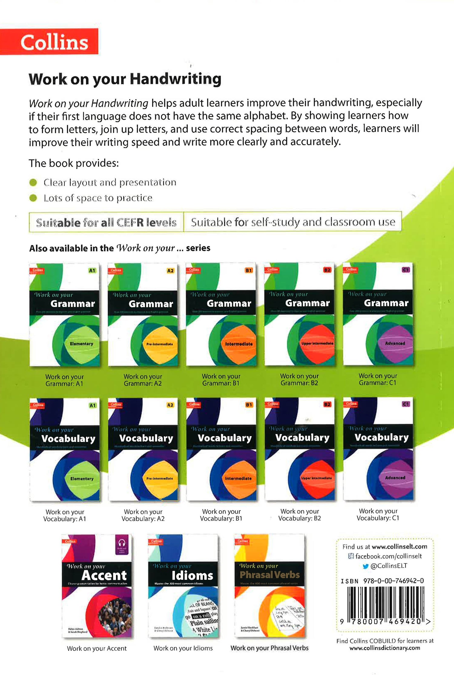 A workbook to help adult learners of English to improve their handwriting. Work on your Handwriting will help students to improve their handwriting in English. This workbook is suitable for EFL/ESL students of all levels whose studies require longhand writing, such as those preparing for the IELTS exams. It is ideal both for use in the classroom and for self-study or academic study. The page-by-page layout with write-in exercises gives students practice of letter, word and sentence formation. It also offers practical guidance and practice to help students to improve their punctuation. Work on your Handwriting is particularly suitable for adult learners of English whose native language has a non-Roman alphabet, such as Arabic or Mandarin. Key features: Letter formation examples and practice, including practice joining up different combinations of letters Joined up writing examples and practice for forming words using continuous text General uppercase and lowercase print examples and practice Practice using correct spacing for letters within words Sentence and short paragraph writing practice, with focus on spacing of words within a sentence Error correction exercises where students pinpoint what is wrong in a text Punctuation guidance and practice