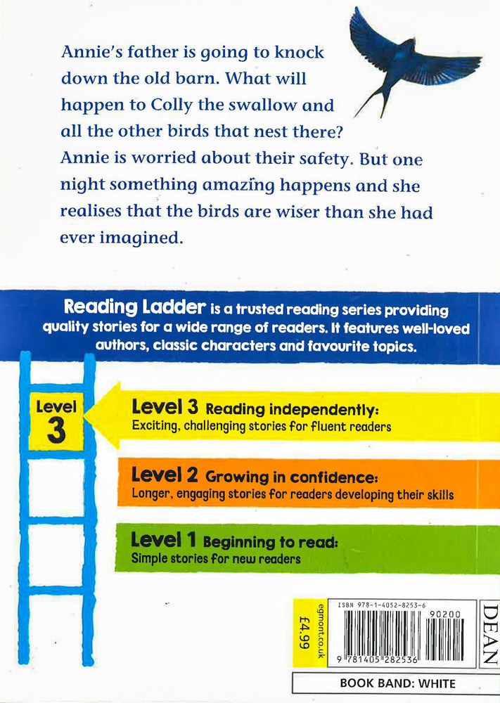 A beautifully crafted chapter book by former Children's Laureate Michael Morpurgo. Perfect for children learning to read. A beautifully crafted chapter book by former Children's Laureate Michael Morpurgo. Perfect for children learning to read. Annie's father is going to knock down the old barn and build a new one. What will happen to Colly the swallow and all the other birds and animals that live there? Annie is worried about their safety. But one night something amazing happens and she realises that the birds are wiser than she could ever have imagined ... The Reading Ladder series helps children to enjoy learning to read. It features well-loved authors, classic characters and favourite topics, so that children will find something to excite and engage them in every title they pick up. It's the first step towards a lasting love of reading. Level 3 Reading Ladder titles are perfect for fluent readers who are beginning to read exciting, challenging stories independently. Varied sentences Detailed illustrations to enjoy Chapters Interesting characters and themes A rich range of vocabulary More complex storylines to stretch confident readers All Reading Ladder titles are developed with a leading literacy consultant, making them perfect for use in schools and for parents keen to support their children's reading. For more information about the series and advice on supporting children's reading, visit: www.egmont.co.uk/readingladder Book band: White.