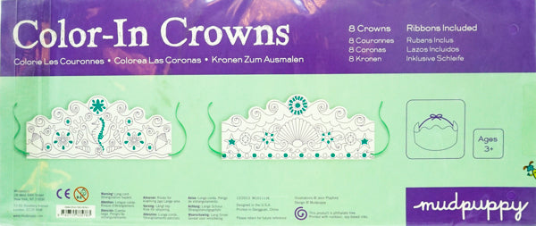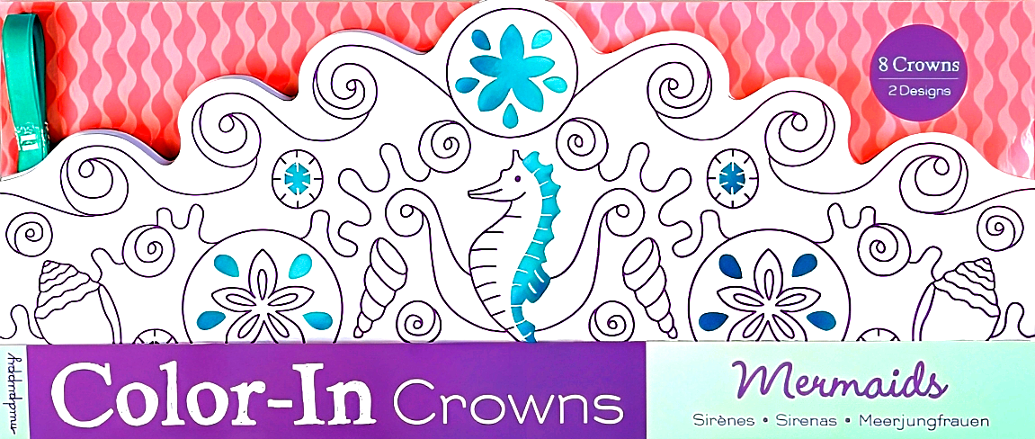 Seahorses and shells adorn Mermaids Color-In Crowns from Mudpuppy. Each themed set includes 8 die-cut paper crowns - 4 each of 2 different designs. Each crown has colored pattern outlines, colored foil highlights, and comes with pre-punched holes to attach the included colored fabric ribbon ties. Illustrated by Barn Eyes(TM). Hats measure approximately 15-1/4 x 5" (38.5 x 13 cm) and are packaged with 8 pre-cut pieces of ribbon all on a colorful backing in a re-sealable plastic sleeve with a hang tag. This product is phthalate free, printed with non-toxic soy-based inks, and is CE compliant. Not suitable for children under 36 months.