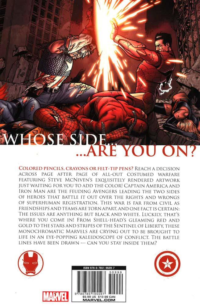 Whose side are you on? Pencil crayons or felt-tip pens? Reach a decision across 120 pages of all-out costumed warfare, featuring Steve McNiven's exquisitely rendered artwork just waiting for you to add the color! Captain America and Iron Man are the feuding Avengers leading the two sides of heroes that battle it out over the rights and wrongs of Superhuman Registration. This War is far from Civil, as friendships and teams are torn apart, and one thing's for sure - the issues are anything but black-and-white. Luckily, that's where you come in! From Shellhead's gleaming red and gold to the stars and stripes of the Sentinel of Liberty, these monochromatic Marvels are crying out to be brought to life in an eye-popping kaleidoscope of conflict. The battle lines have been drawn...now, can you stay inside them?