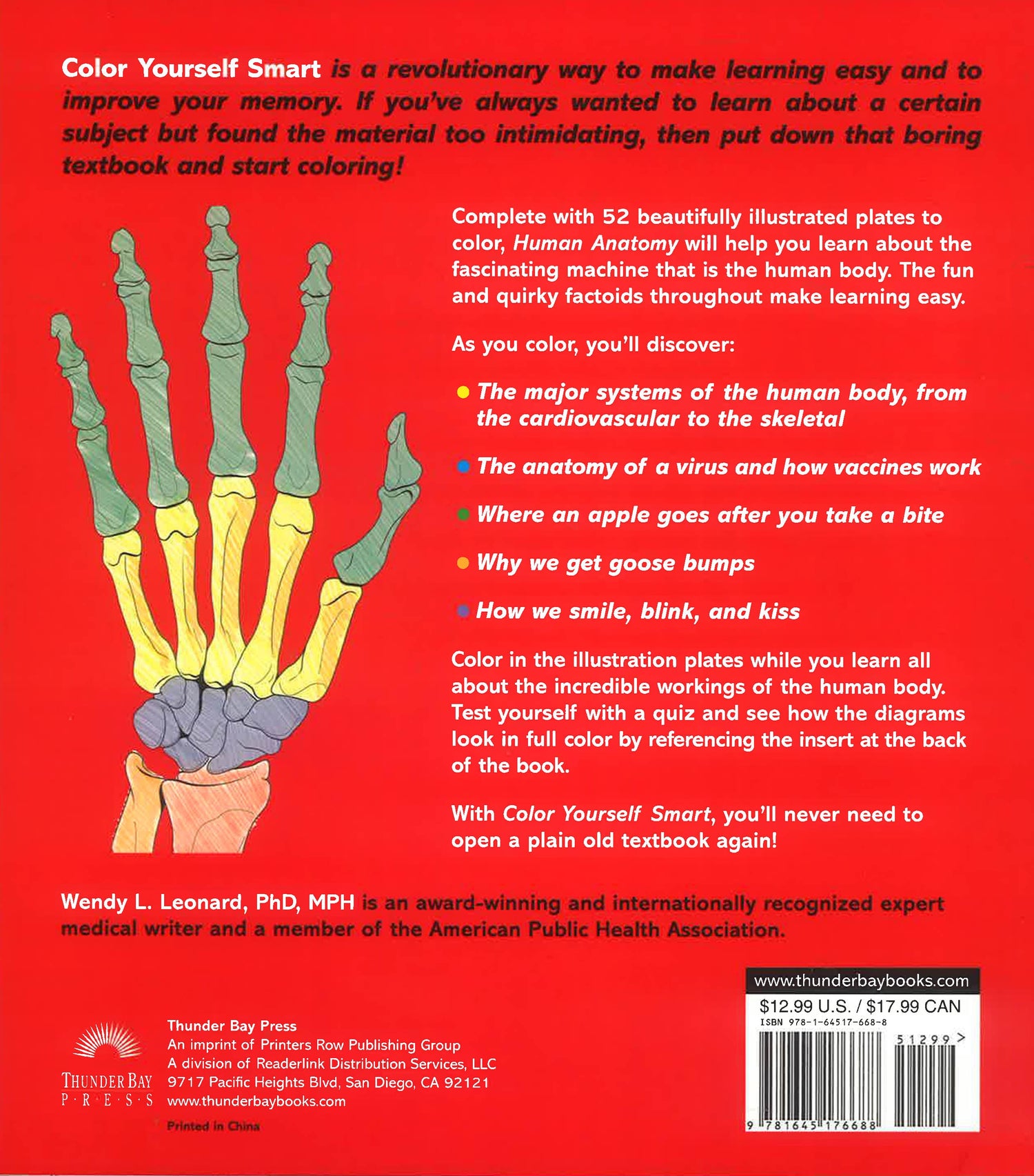 In Color Yourself Smart: Human Anatomy, you’ll fill in detailed illustrations and learn the names and functions of all the different parts of the human body. In addition to gaining basic knowledge, you’ll also discover some of the body’s greatest secrets. Why do we get goose bumps? What happens when we eat an apple? How much air can we breathe in just one minute? Many memory experts believe that colors and illustrations can help us form stronger memories. When you color yourself smart, you’ll be sure to agree! You’ll never forget the many parts of the body—and their equally important functions. Great for kids 12 and up who want to supplement homeschool or classroom lessons.