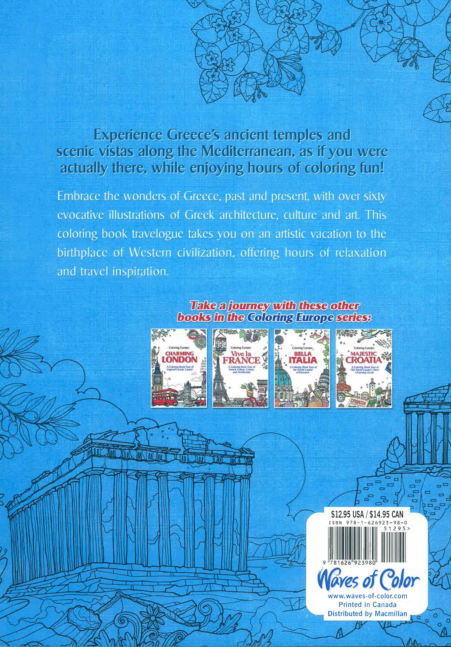 Coloring Europe: Magical Greece is a part of Waves of Color’s “Coloring Europe” line—a collection of coloring books that shows off the fun and culture of Europe’s most iconic locales. Visit the bustling streets of Greece as you experience the culture and flavor of a country steeped in a rich history. From its delectable foods to its heroic architecture, color the sights and scenes of Greece as brought to life by Il-Sun Lee’s dynamic artwork.