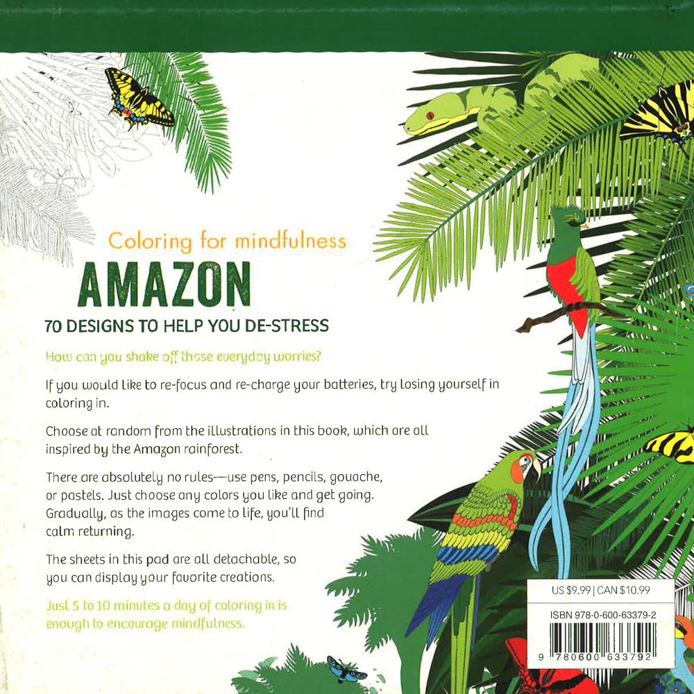 70 Design to help you de-stress. If you would like to re-fokus and re-charge your batteries, try losing yourself in coloring in.Choose at random from the illustrations in this book, which are all inspired by the amazon rainforest. There are absolutely no rules use pens, pencils, gouache, or pastels. Just choose any colours you like and get going. Gradually, as the images come to life, you'll find calm returning. The sheets in tihs pad are all detachable, so you can display your favourite creations. Just 5 to 10 minutes a day of coloring in is enoughto encourage mindfulness.