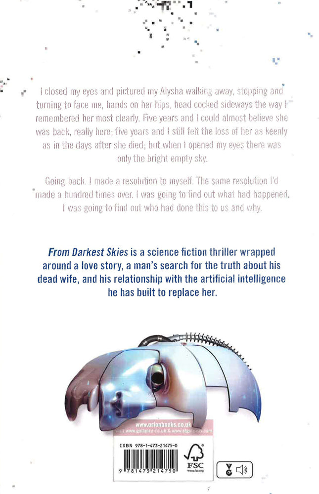 FROM DARKEST SKIES is a high-concept science fiction thriller wrapped around a love story, a man's search for the truth about his dead wife, and his relationship with the artificial intelligence he has built to replace her. Set in a future where the aliens came, waged war, and then vanished again, this is a striking new voice in science fiction.After a five year sabbatical following the tragic death of his wife and fellow agent Alysha, Keon Rause returns to the distant colony world of Magenta to resume service with the Magentan Intelligence Service. With him he brings an artificial recreation of his wife's personality, a simulacrum built from every digital trace she left behind. She has been constructed with one purpose - to discover the truth behind her own death - but Keon's relationship with her has grown into something more, something frighteningly dependent, something that verges on love.Cashing in old favours, Keon uses his return to the Service to take on a series of cases that allow him and the artificial Alysha to piece together his wife's last days. His investigations lead him inexorably along the same paths Alysha followed five years earlier, to a sinister and deadly group with an unhealthy fascination for the unknowable alien Masters; but as the wider world of Magenta is threatened with an imminent crisis, Keon finds himself in a dilemma: do his duty and stand with his team to expose a villainous crime, or sacrifice them all for the truth about his wife?