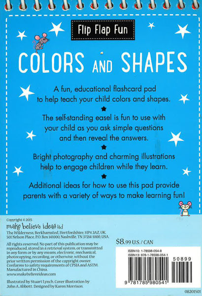A fun, educational flashcard pad to help teach your child colors and shapes. The self-standing easel is fun to use with your child as you ask simple questions and then reveal the answers. Bright photography and charming illustrations help to engage children while they learn. Notes for parents provide guidance on how best to use this pad and help make learning fun!