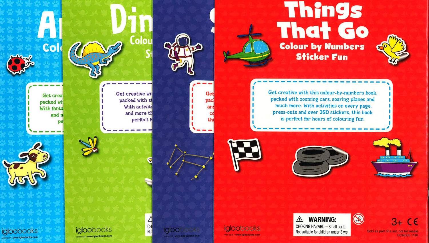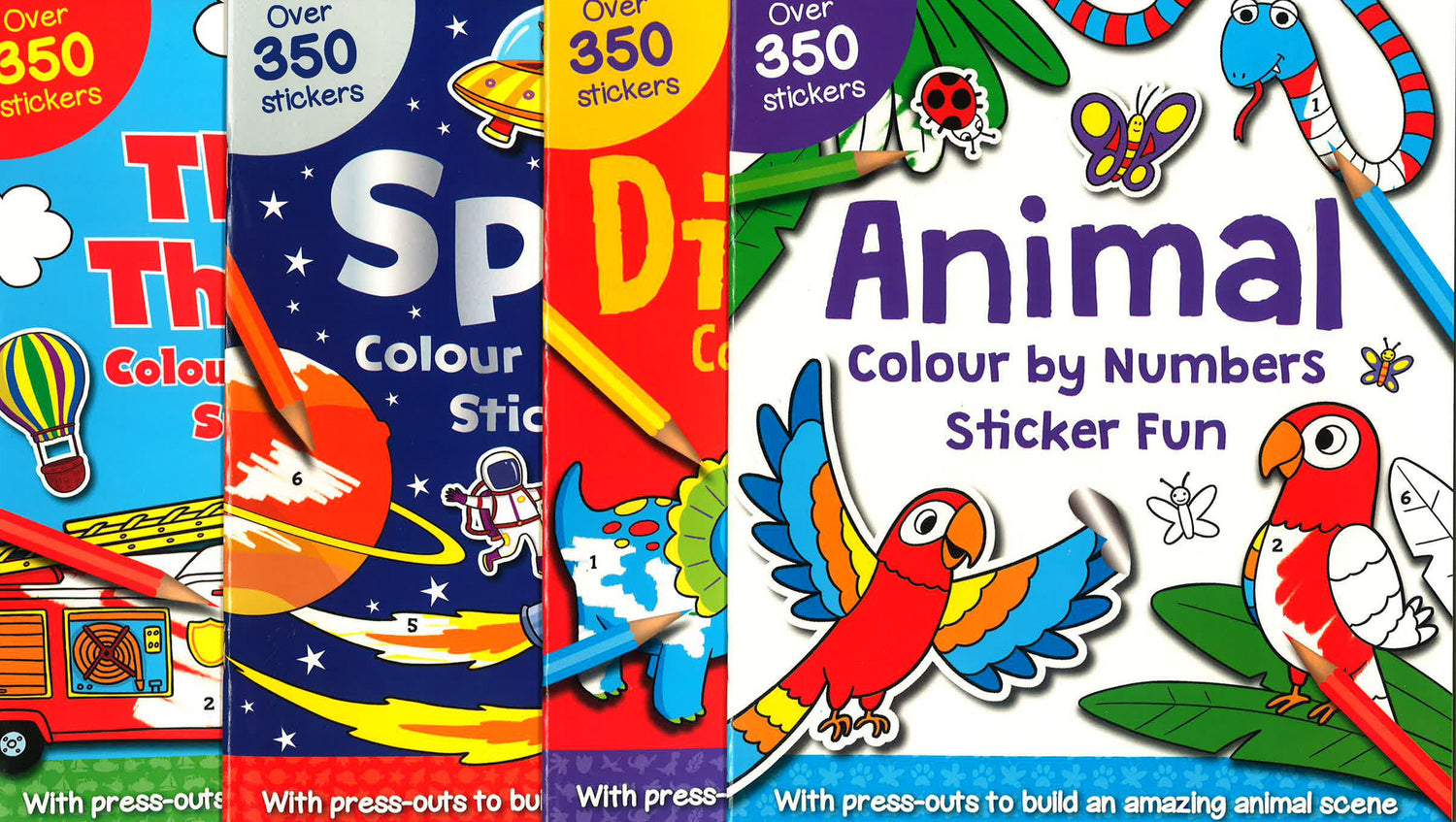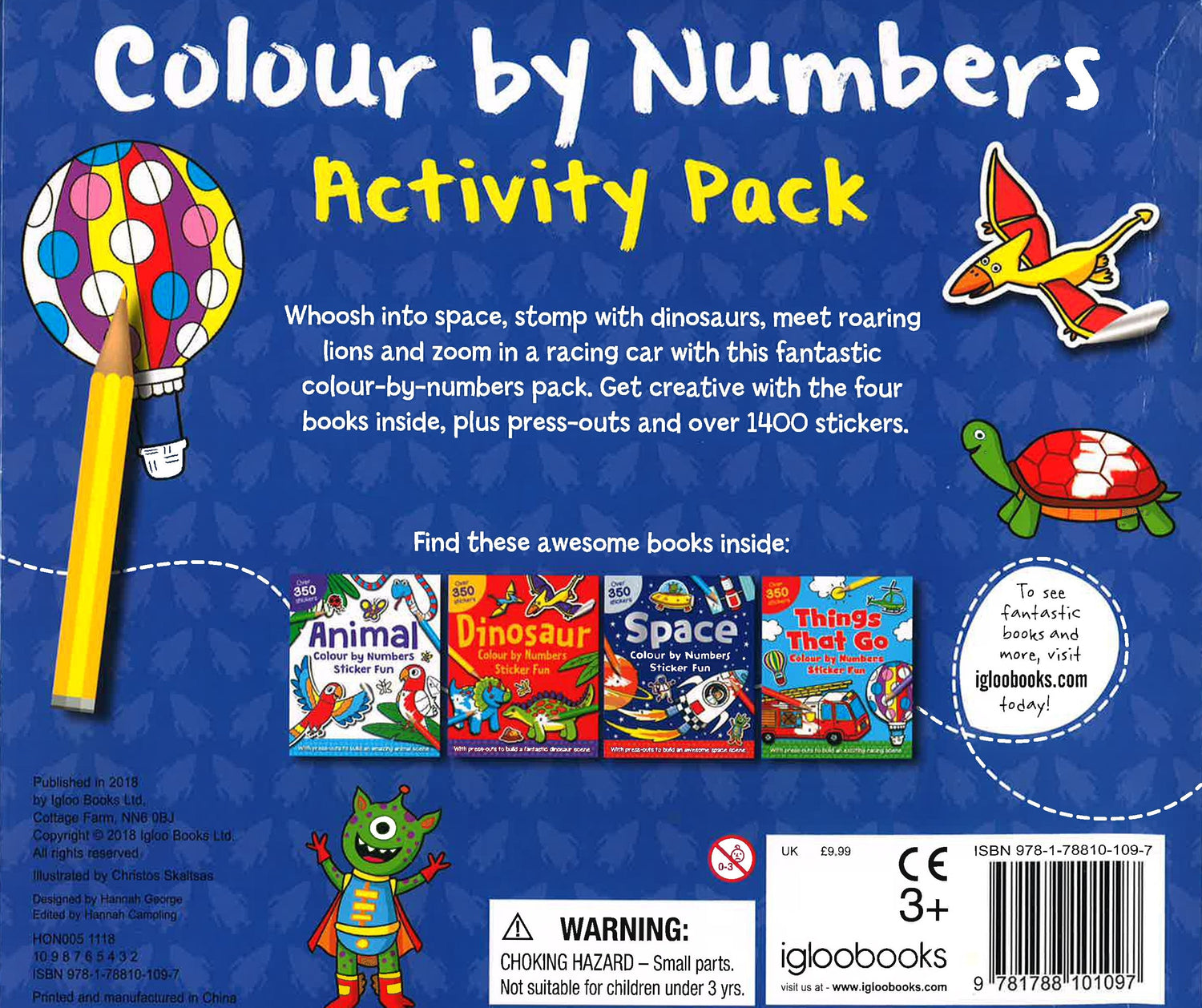 Whoosh into space, stomp with dinosaurs, meet roaring lions and zoom in a racing car with this fantastic colour-by-numbers pack. Get creative with the four books inside, plus press-outs and over 1400 stickers.