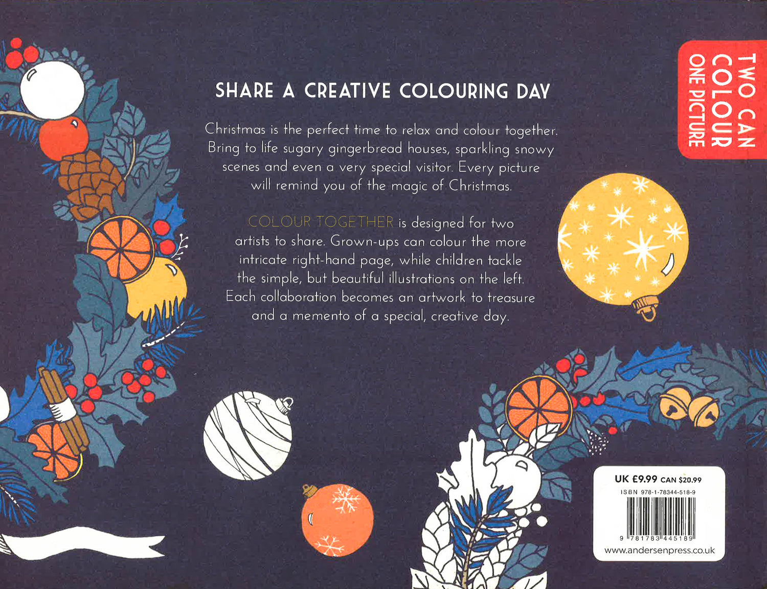 Take a break this Christmas for some creative colour-together time. From festive decorations to scenes of celebration, there's a new challenge every time you turn a page. Each scene is lavishly illustrated with a large, simple picture on one side and a more complicated, patterned picture on the other, so parent and child or older and younger siblings can have fun creating art to treasure together. The perfect way to find a little piece of peace on earth this Christmas.