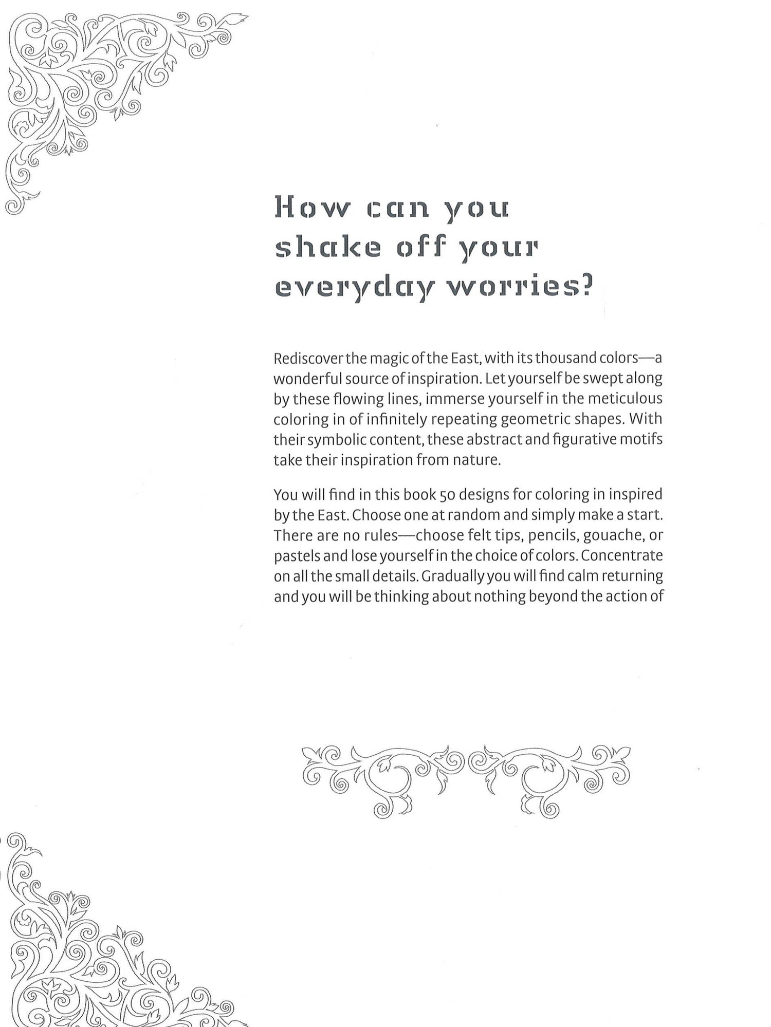 How can you shake off everyday worries? Let the magic of the East transport you to a world of a thousand and one colors and lose l yourself in all the little details of coloring in. These 50 designs include geometric and ornamental shapes, arabesques, scrolls, and much more.