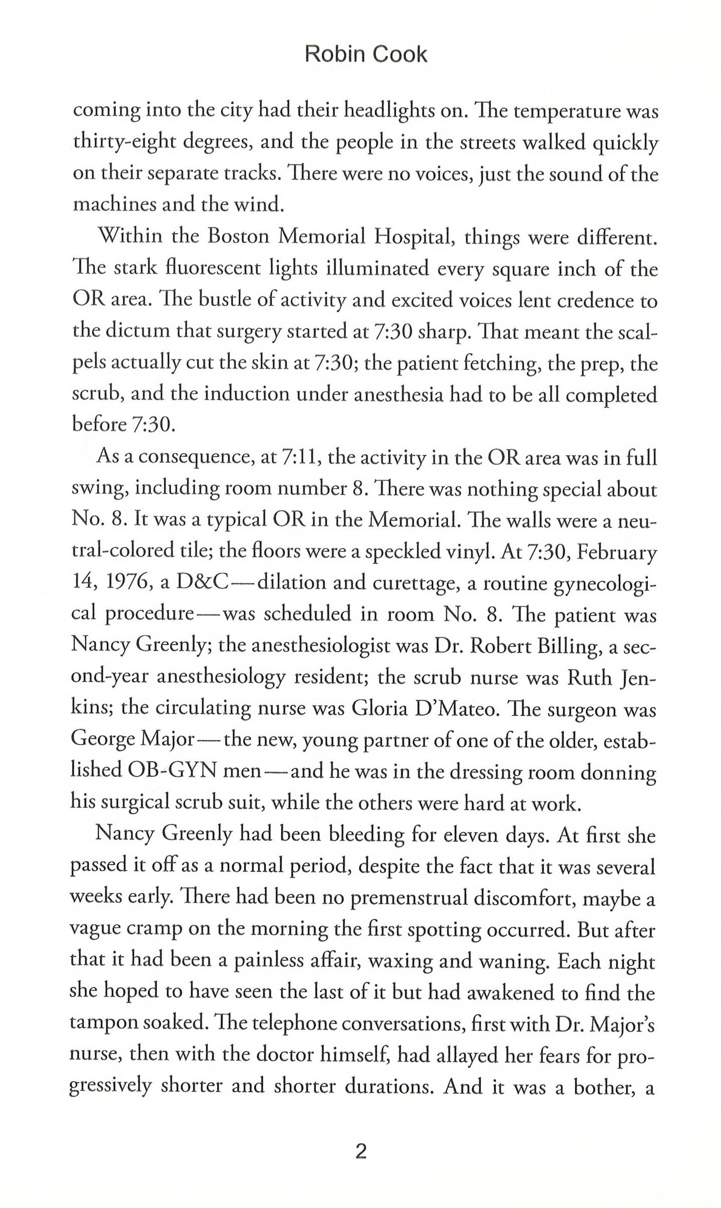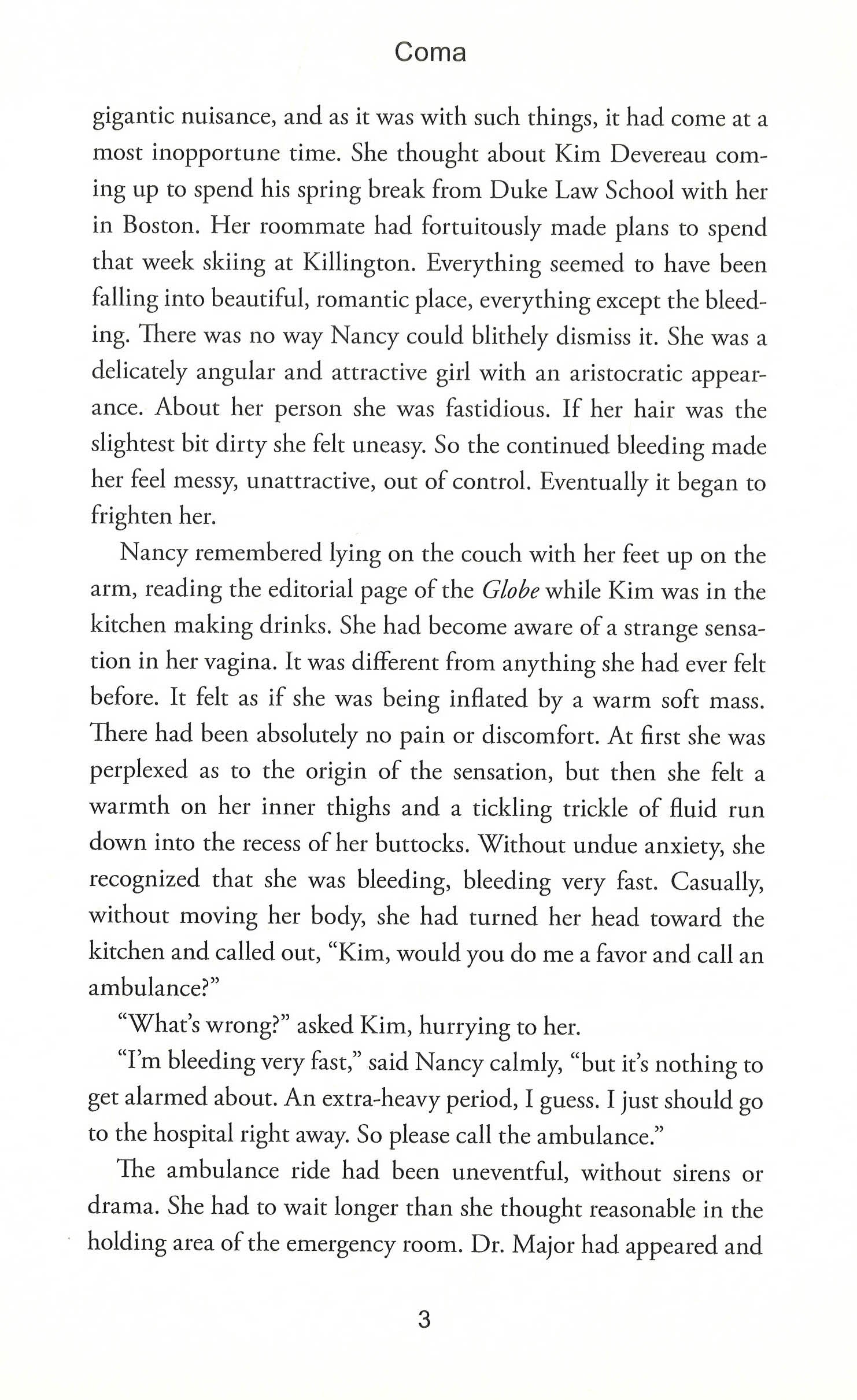 They called it "minor surgery," but Nancy Greenly, Sean Berman and a dozen others - all admitted to Boston Memorial Hospital for routine procedures - -were victims of the same inexplicable, hideous tragedy on the operating table. They never woke up.Susan Wheeler is a third-year medical student working as a trainee at Boston Memorial Hospital. Two patients during her residency mysteriously go into comas immediately after their operations due to complications from anesthesia. Susan begins to investigate the causes behind both of these alarming comas and discovers the oxygen line in Operating Room 8 has been tampered with to induce carbon monoxide poisoning.Then Susan discovers the evil nature of the Jefferson Institute, an intensive care facility where patients are suspended from the ceiling and kept alive until they can be harvested for healthy organs. Is she a participant in - or a victim of - a large-scale black market dealing in human organs?