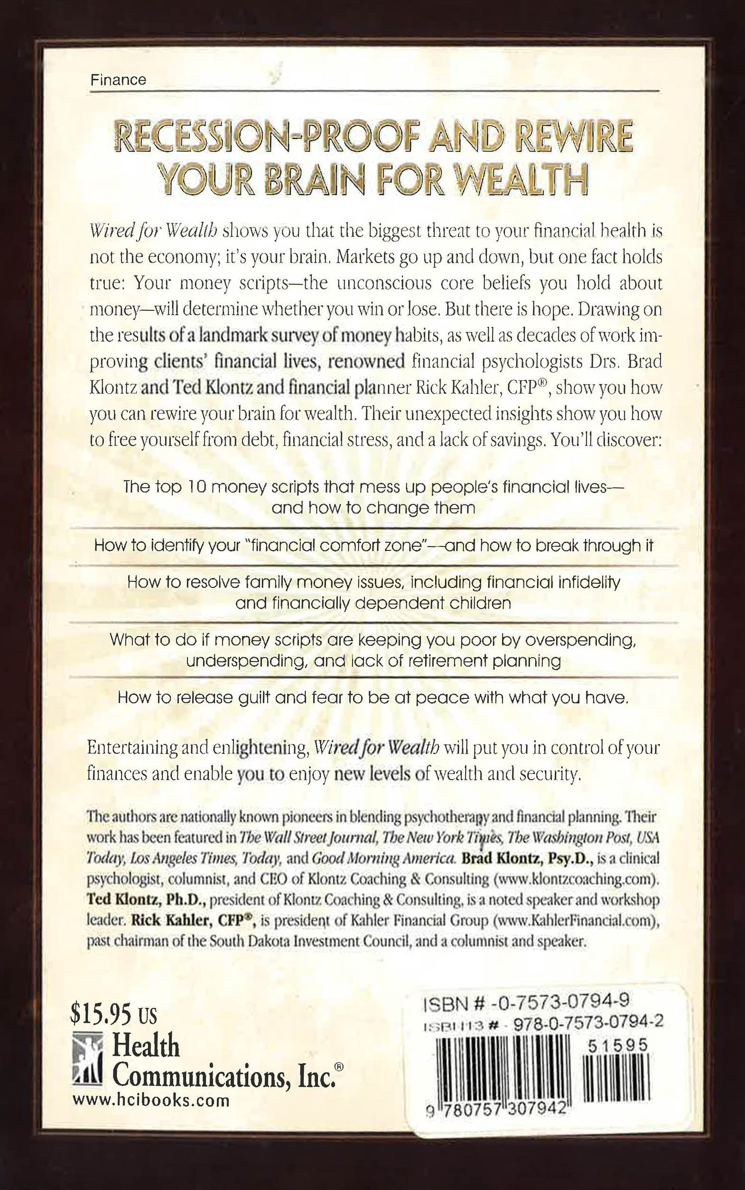 Neuroscience and money are being bandied about from Wall Street to Main Street, with people realizing that what goes on in their brain directly impacts their bank account. As financial stress mounts and an economic crash looms, the Wired for Wealth authors show that the biggest threat to your financial health is not a recession, it's your mindset. Markets fluctuate but one fact holds true: People's money scripts-the unconscious core beliefs they hold about money-will determine whether they win or lose. With Wired for Wealth, three respected experts explain their proven Money Makeover Program that has helped clients break through excessive debt, financial stress, self-sabotage, money avoidance, and more.