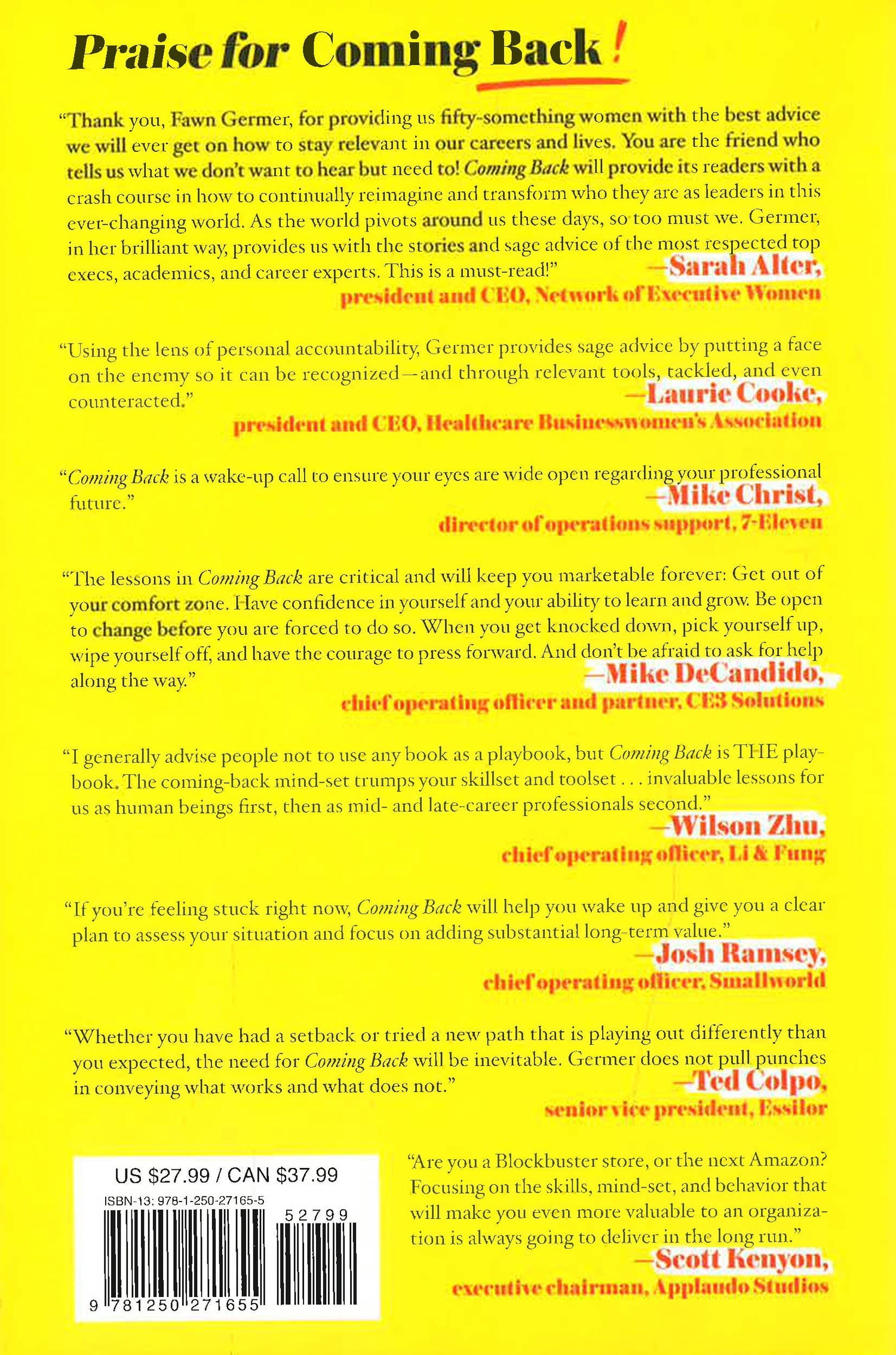 Millions of mid- and late-career professionals are wondering why our careers are dying. We've been fired, downsized, job-eliminated, or we've left work voluntarily to raise children, care for loved ones, or go to school. Our unemployment rate is more than three times the national average. It takes twice as long to get hired, usually for far less money than we were making. Is it age discrimination? Maybe. But it's not that simple. So many of us have lagged on skills and technology, shrugged off social media, or ignored the rate of change and let younger people become the face of our profession's future. Our 'track record' really doesn't matter. We want to come back, but we aren't ready. Coming Back offers clear advice, including: -Make yourself visible and relevant by sharing articles and information on your field with colleagues and on social media. -Use LinkedIn to build your network in your industry and identify decision makers. -Tell interviewers about what you will do - don't rely on what you have done. -Stop grousing about 'those millennials' and start working with them. -Volunteer strategically to build leadership skills and networks. Coming Back shows how you can save a career if still employed or get one back if cast out. Fawn Germer, one of the nation's most popular leadership experts and global motivational speakers, has personally interviewed more than 300 CEOs, senior executives, professors, lawyers, organizational experts, industry leaders and professionals. The result is a tactical, tough-love call to action: to learn, re-tool, connect, grow, and get ready to work again.
