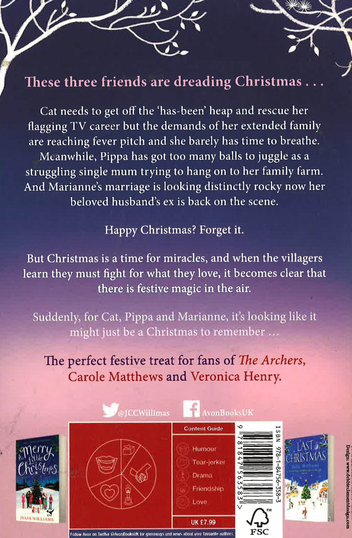 Warm, humorous and completely irresistible. All you want for Christmas is right here! "Terrifically warm, with lovely, lively characters." Fiona Walker "This story warms you like a cosy cup of cocoa." Closer These three friends are dreading Christmas... Cat needs to get off the 'has-been' heap and rescue her flagging TV career, but the demands of her extended family are reaching fever pitch and she barely has time to breathe. Meanwhile, Pippa has got too many balls to juggle as a struggling single mum trying to hang on to her family farm. And Marianne's marriage is looking distinctly rocky now her beloved husband's ex is back on the scene. Happy Christmas? Forget it. But Christmas is a time for miracles, and when the villagers learn they must fight for what they love, it becomes clear that there is festive magic in the air. Suddenly for Cat, Pippa and Marianne, it's looking like it might just be a Christmas to remember...