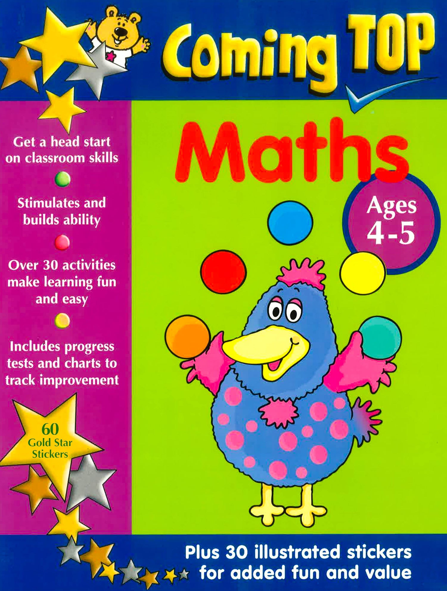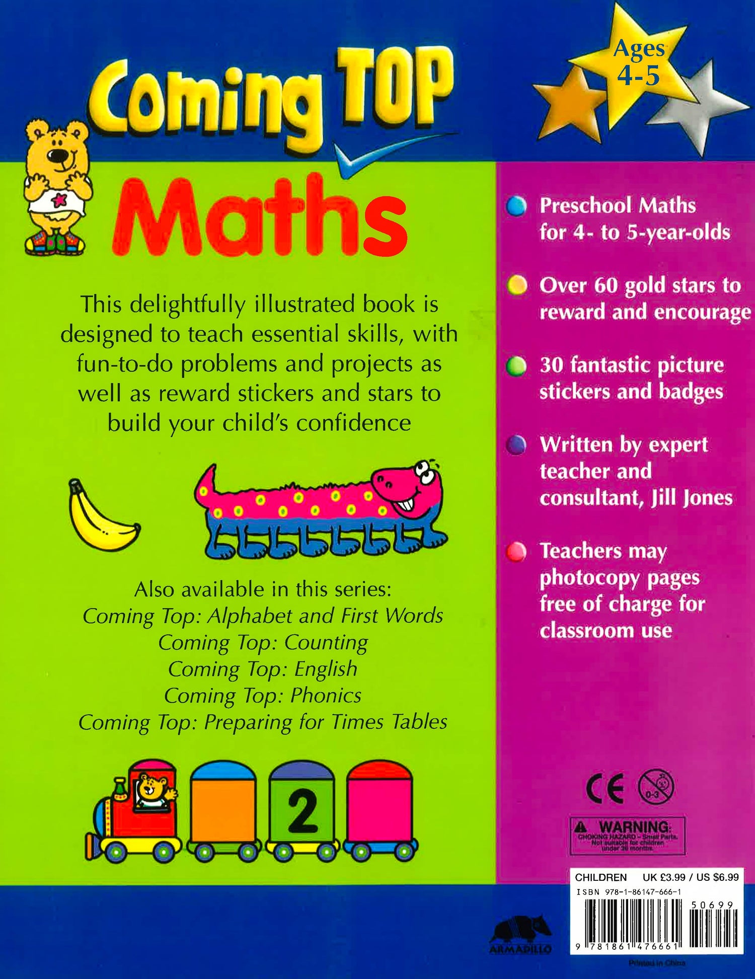 This book includes 60 gold star stickers - and 30 illustrated stickers for added fun and value. You can get a head start on classroom skills. It includes over 25 write-in activities make learning fun and easy - add up the animals, fill in the missing digits, count the legs on the monsters, put days of the week and months of the year in the correct sequence, and much more. With reusable stickers to put on every page, it includes progress tests and charts to track improvement and build ability. Teachers may photocopy pages for school use. This fantastic learning book has been compiled by a highly experienced teacher and educational consultant, and each concept is explained in a fun way with delightful illustrations. Match numbers of objects to figures and words, place a sequence of pictures in the right order, and play the big banana adding game. Not only are the activities entertaining, but they also allow youngsters to apply what they have learned, gaining confidence with each puzzle that they solve. Children will want to learn more and come top in Maths!