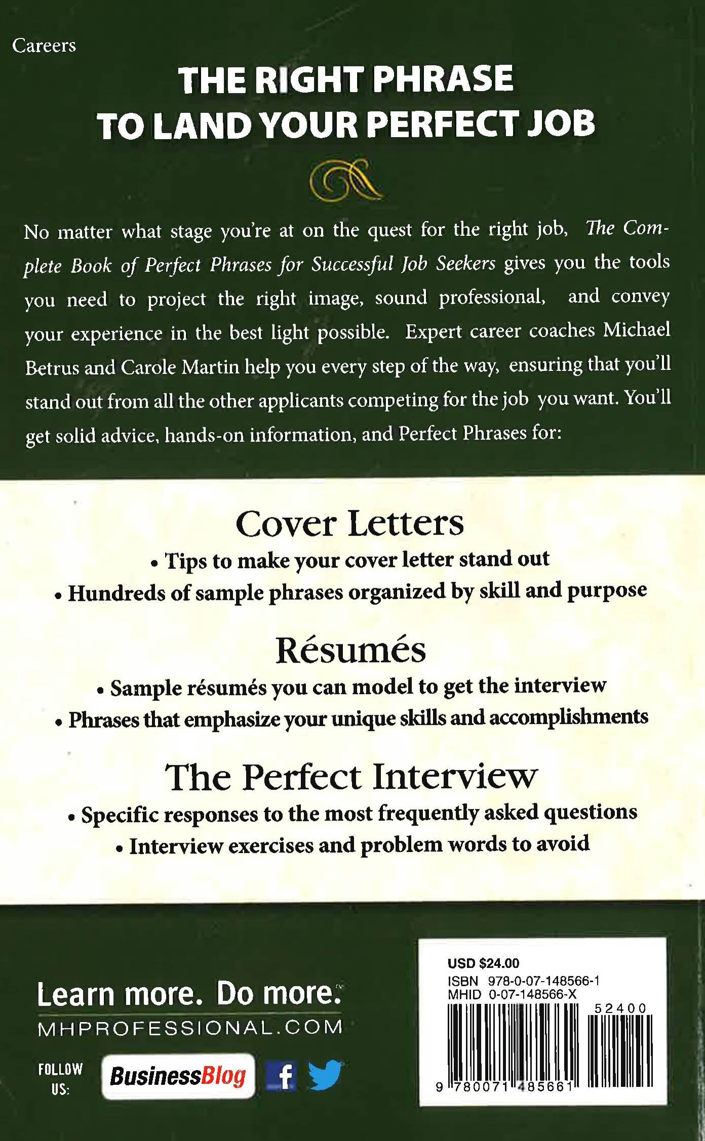 Complete Perfect Phrases series gives managers and job-seekers all the phrases, expertise, and guidance they need to meet and exceed their goals. The Complete Book of Perfect Phrases for Job Seekers shows how to project the right image, sound professional, and convey their experience in the best light possible. Expert career coaches Michael Betrus and Carole Martin provide the precise phrases for every stage--from writing the cover letter to putting together a resume to blowing them away at the interview--helping you stand out from all the other applicants.
