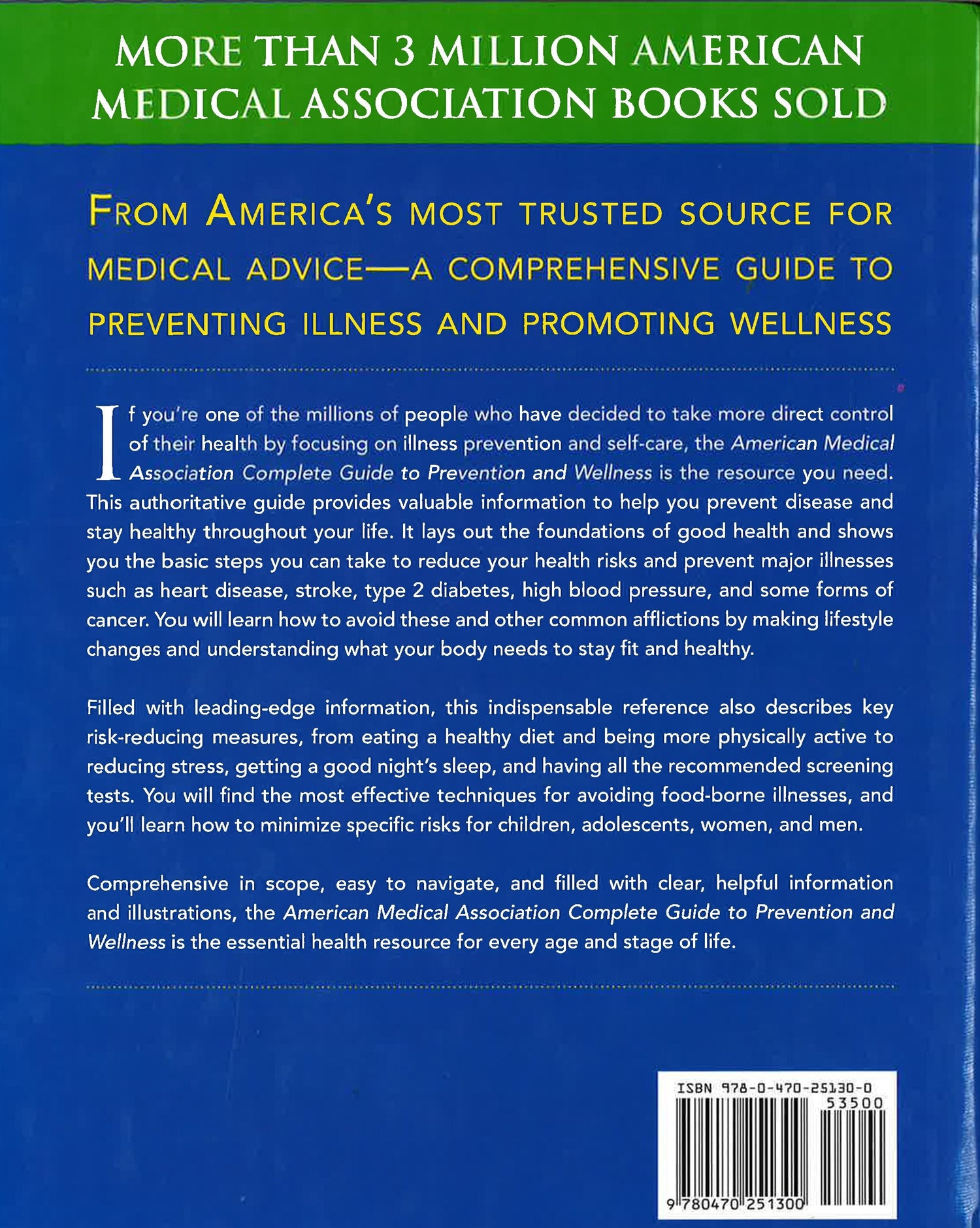 If you're one of the millions of people who have decided to take more direct control of their health by focusing on illness prevention and self-care, the American Medical Association Complete Guide to Prevention and Wellness is the resource you need. This authoritative guide provides valuable information to help you prevent disease and stay healthy throughout your life. It lays out the foundations of good health and shows you the basic steps you can take to reduce your health risks and prevent major illnesses such as heart disease, stroke, type 2 diabetes, high blood pressure, and some forms of cancer. You will learn how to avoid these and other common afflictions by making lifestyle changes and understanding what your body needs to stay fit and healthy. Filled with leading-edge information, this indispensable reference also describes key risk-reducing measures, from eating a healthy diet and being more physically active to reducing stress, getting a good night's sleep, and having all the recommended screening tests. You will find the most effective techniques for avoiding food-borne illnesses, and you'll learn how to minimize specific risks for children, adolescents, women, and men. Comprehensive in scope, easy to navigate, and filled with clear, helpful information and illustrations, the American Medical Association Complete Guide to Prevention and Wellness is the essential health resource for every age and stage of life.