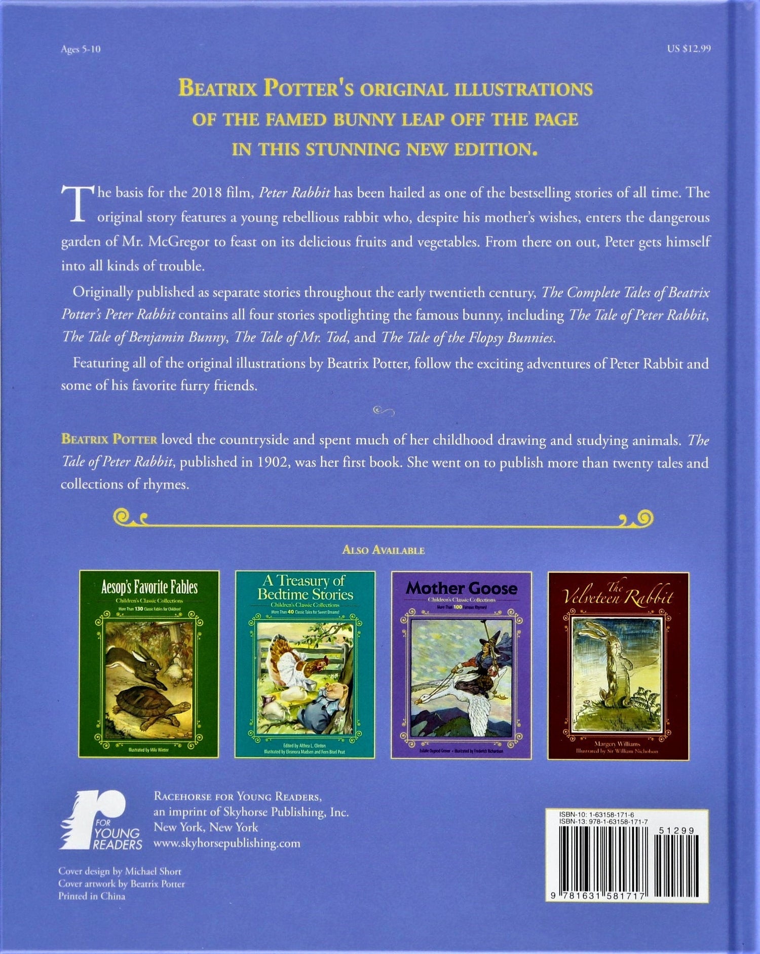The basis for the 2018 film, Peter Rabbit has been hailed as one of the bestselling stories of all time and has been adapted into countless mediums, including books, films, board games, coloring books, and more. The original story features a young rebellious rabbit who, despite his mother’s wishes, enters the dangerous garden of Mr. McGregor to feast on its endless bounty. From there on out, he gets himself into all kinds of trouble.Originally published as separate stories throughout the early twentieth century, The Complete Tales of Beatrix Potter’s Peter Rabbit contains all four stories featuring the famous bunny, including The Tale of Peter Rabbit, The Tale of Benjamin Bunny, The Tale of Mr. Tod, and The Tale of the Flopsy Bunnies.Featuring all of the original illustrations by Beatrix Potter enhanced and re-formatted, follow the exciting adventures of Peter Rabbit and some of his most famous furry friends.