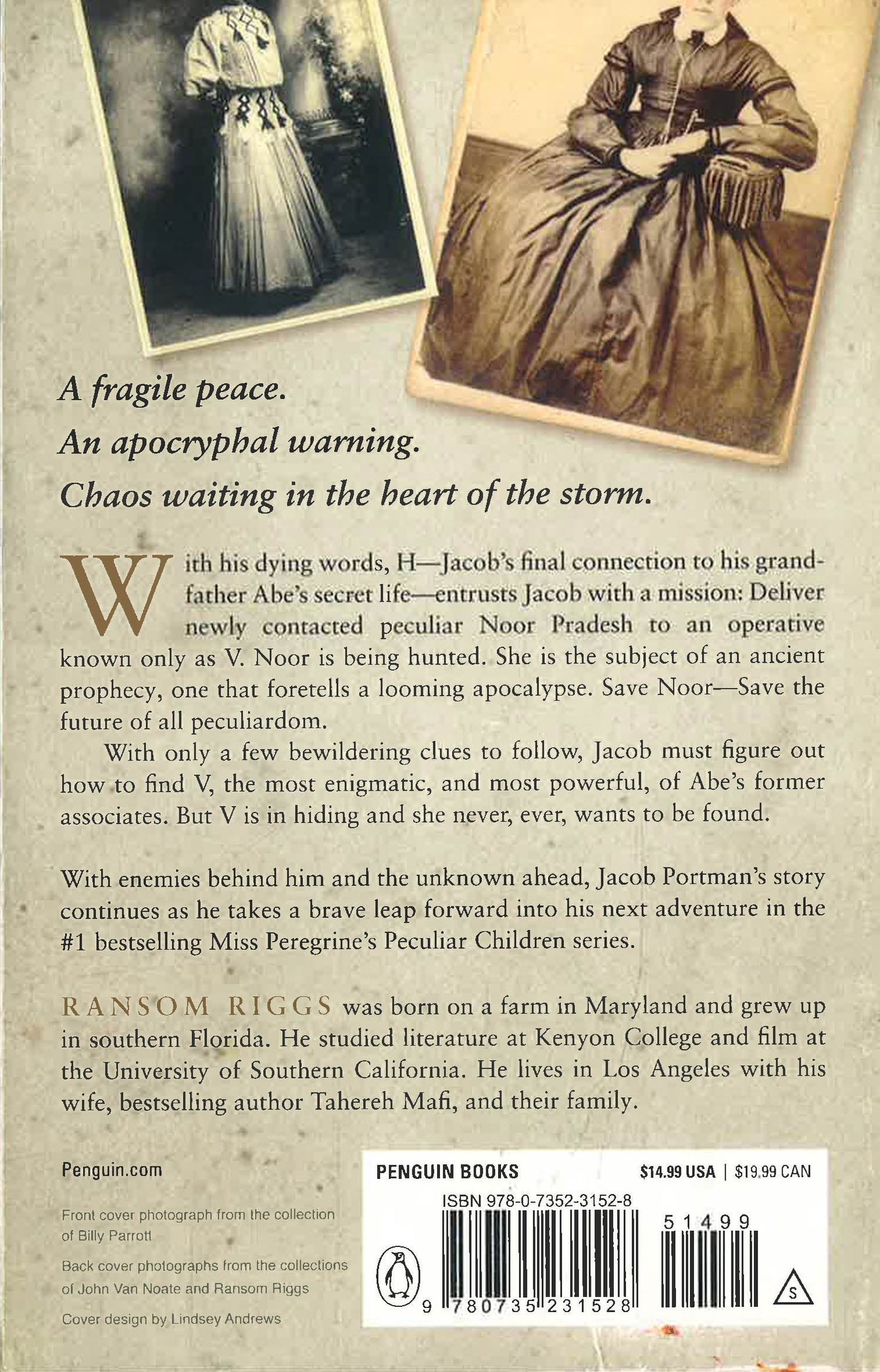With his dying words, H—Jacob Portman’s final connection to his grandfather Abe’s secret life entrusts Jacob with a mission: Deliver newly contacted peculiar Noor Pradesh to an operative known only as V. Noor is being hunted. She is the subject of an ancient prophecy, one that foretells a looming apocalypse. Save Noor—Save the future of all peculiardom.