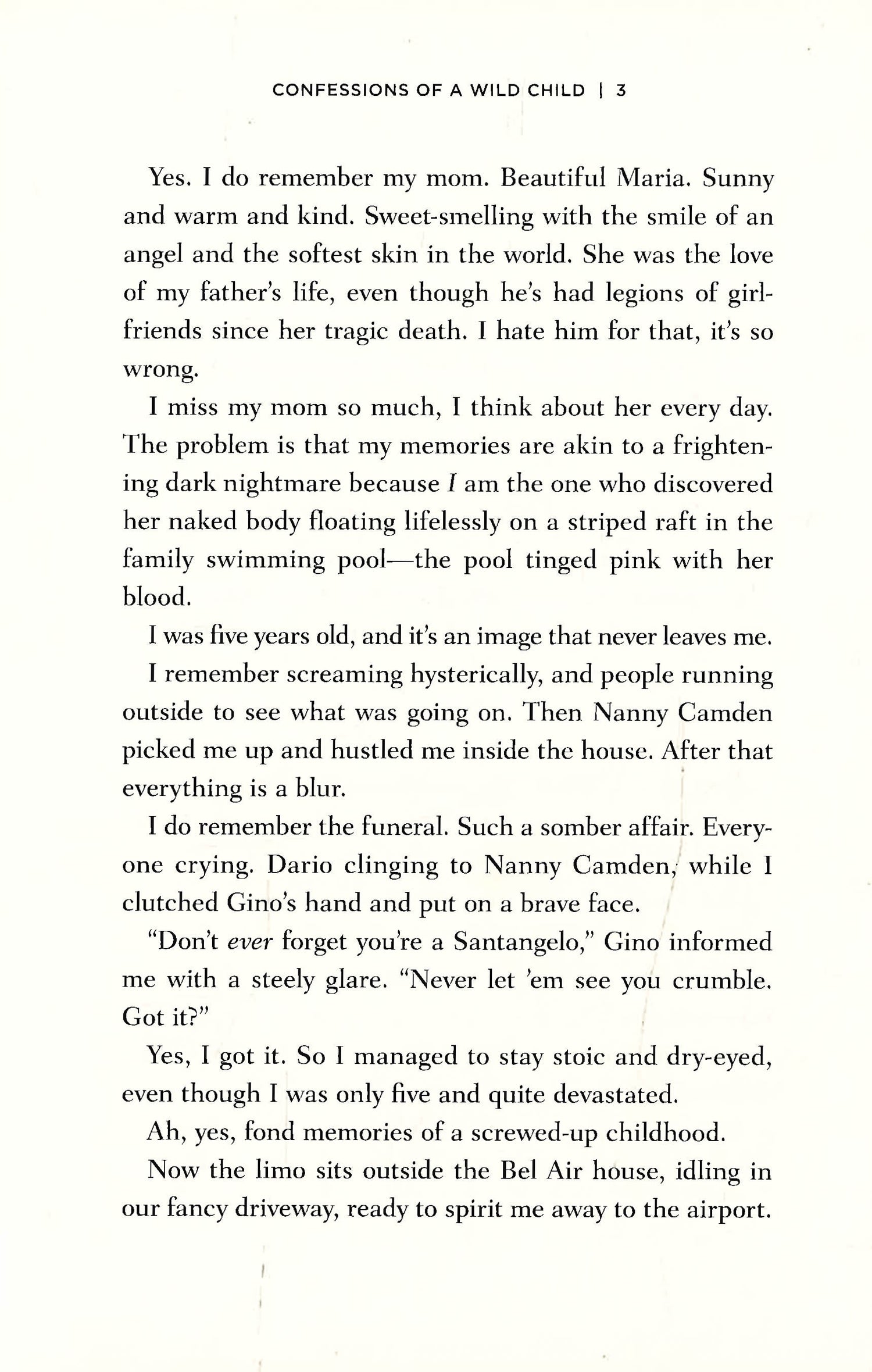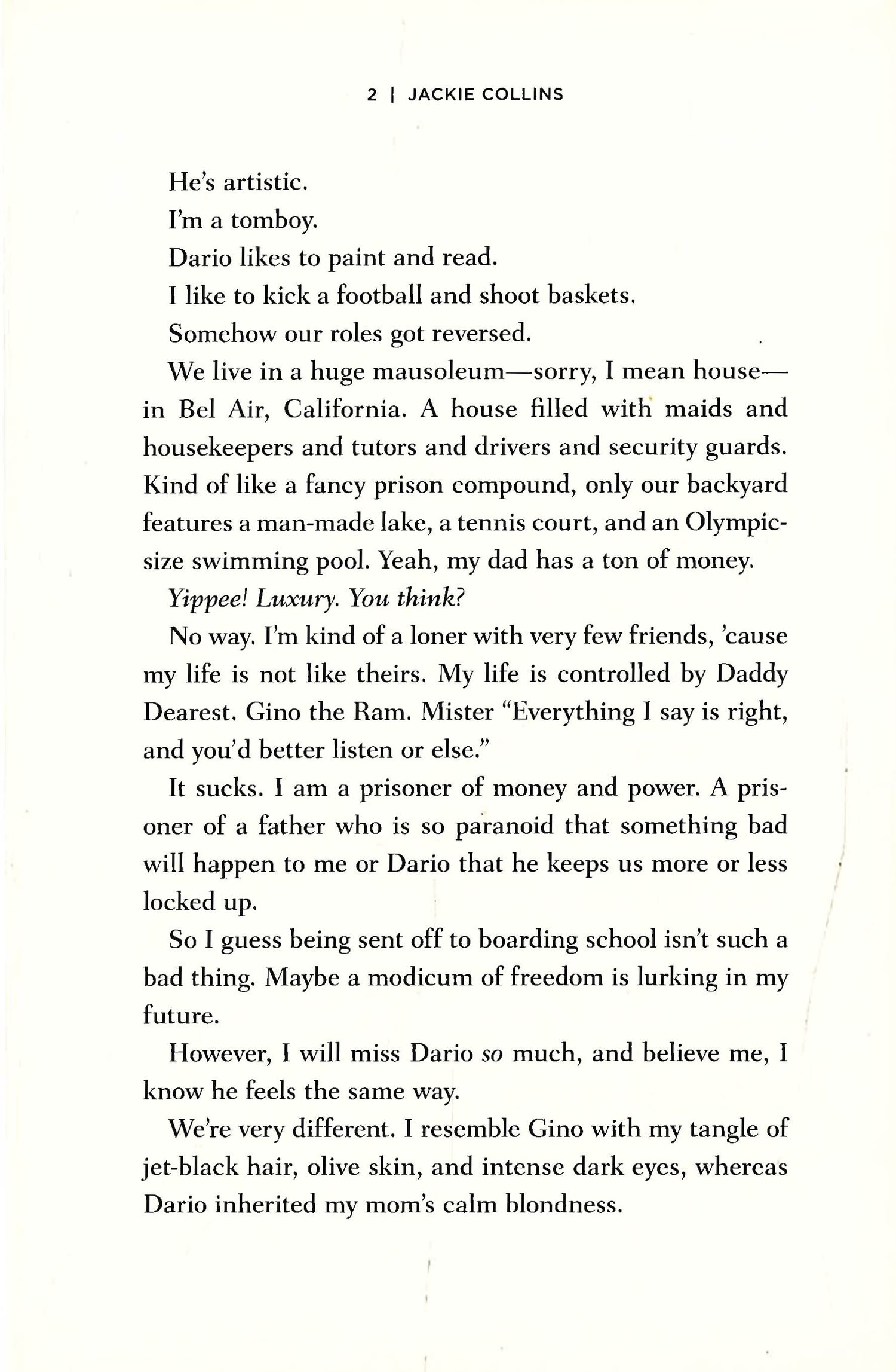 Lucky Santangelo. A fifteen-year-old wild child ready to discover life, love and independence. Daughter of the notorious Gino, Lucky discovers her mother's murdered body floating in the family swimming pool at the tender age of four. Since then Gino has kept her protected from life closeted in their Bel Air mansion. But in Jackie Collins' "Confessions of a Wild Child," Lucky finally breaks free, and running away from boarding school the adventures begin. Boys, sex, drugs and rock n' roll - Lucky explores it all in preparation for the strong, kick-ass woman she eventually becomes. Delve into the world that Lucky rules!