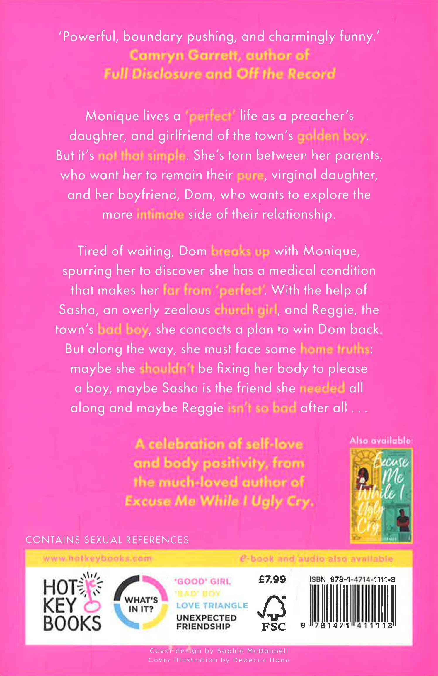 The hotly anticipated second book from Joya Goffney, author of the 2021 YA romcom Excuse Me While I Ugly Cry. Monique lives a perfect life - a preacher's daughter and the girlfriend of the town's golden boy. But it's not that simple. She's torn between her parents who want the pure virginal daughter, and her boyfriend, Dom, who wants to explore the more intimate side of their relationship. Tired of waiting, her boyfriend breaks up with her, spurring Monique to discover she has a medical condition that makes her far from perfect and she concocts a plan to fix her body and win him back. With the help of her frenemy, Sasha, the overly zealous church girl Monique's mum pushes her to hang out with, and Reggie, the town's bad boy, Monique must go on trips to unknown and uncomfortable places to find the treatment that will help her. But in doing so, she must face some home truths: maybe she shouldn't be fixing her body to please a boy, maybe Sasha is the friend she needed all along and maybe Reggie isn't so bad at all. This is a powerful journey towards loving yourself, about body and sex positivity, with heart, humour, family intrigue and a dynamic and delicious love triangle. Contains explicit references to sex and sexual health.