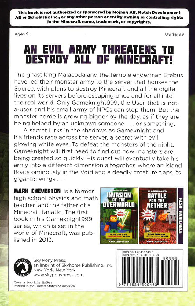 An evil army threatens to destroy all of Minecraft in the third Gameknight999 adventure! The ghast king Malacoda and the terrible enderman Erebus have led their monster army to the server that houses the Source, with plans to destroy Minecraft and all the digital lives on its servers before escaping once and for all into the real world. Only Gameknight999, the User-that-is-not-a-user, and his small army of NPCs can stop them. But the monster horde is growing bigger by the day, as if they are being helped by an unknown someone . . . or something.