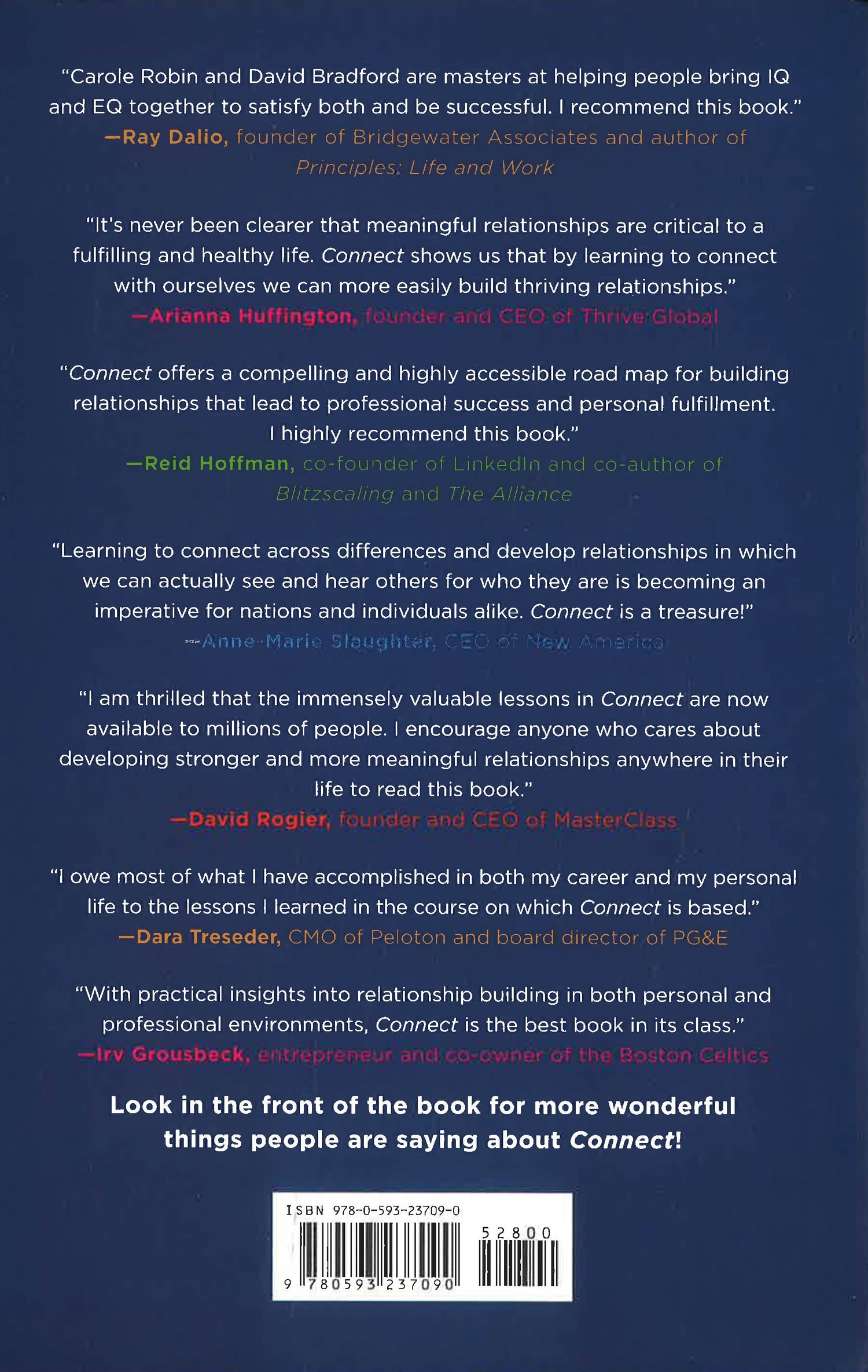David Bradford and Carole Robin taught interpersonal skills to MBA candidates for a combined seventy-five years in their legendary Stanford Graduate School of Business course Interpersonal Dynamics (affectionately known to generations of students as "Touchy-Feely") and have coached and consulted hundreds of executives for decades. In Connect, they show readers how to take their relationships from shallow to exceptional by cultivating authenticity, vulnerability, and honesty, while being willing to ask for and offer help, share a commitment to growth, and deal productively with conflict.