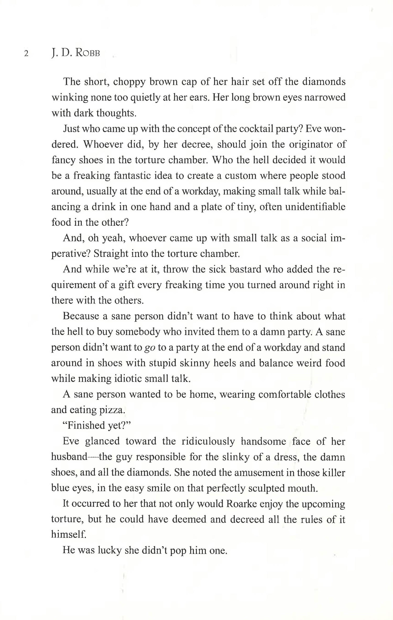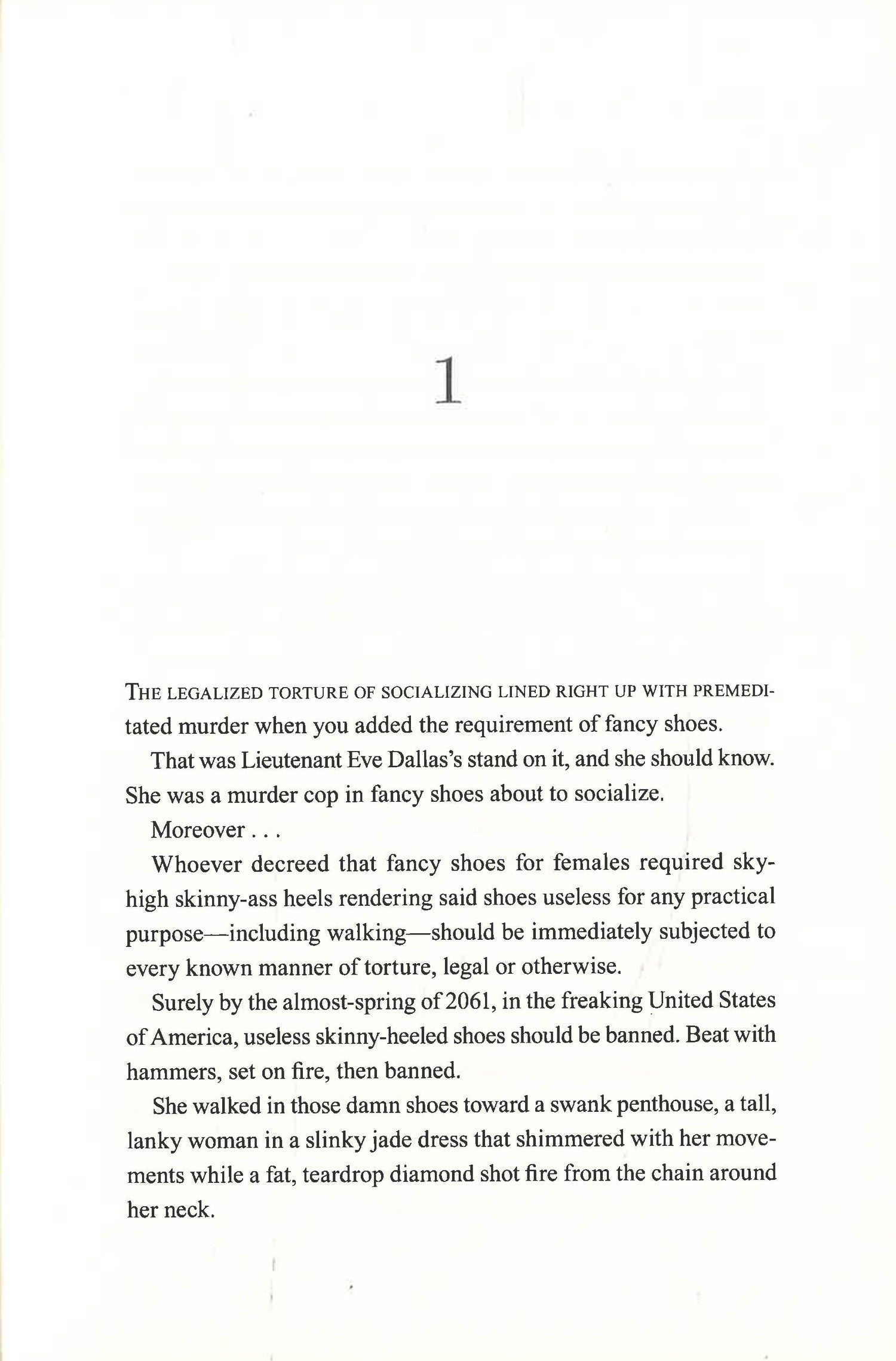 Now Eve and Roarke must venture into the gang territory where Lyle used to run, and the ugly underground world of tattoo parlors and strip joints where everyone has taken a wrong turn somewhere. They both believe in giving people a second chance. Maybe even a third or fourth. But as far as they’re concerned, whoever gave the order on Lyle Pickering’s murder has run out of chances…
