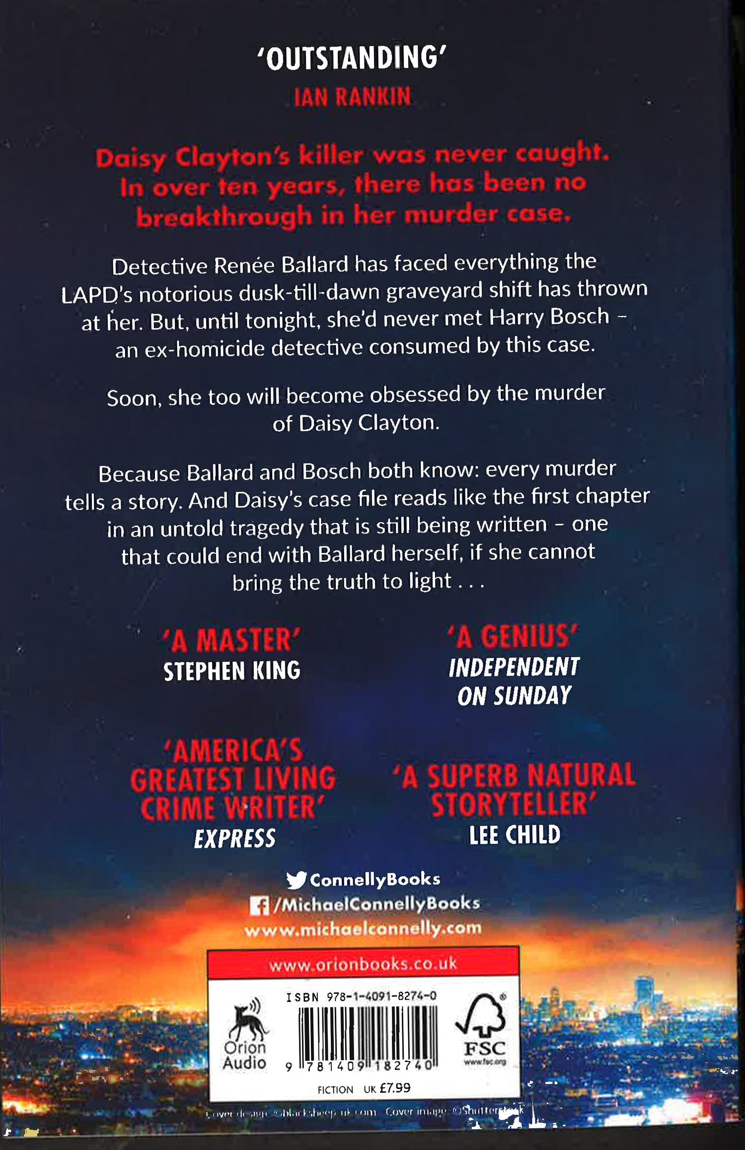 Daisy Clayton's killer was never caught. In over ten years, there has been no breakthrough in her murder case. Detective Renee Ballard has faced everything the LAPD's notorious dusk-till-dawn graveyard shift has thrown at her. But, until tonight, she'd never met Harry Bosch - an ex-homicide detective consumed by this case.Soon, she too will become obsessed by the murder of Daisy Clayton. Because Ballard and Bosch both know: every murder tells a story. And Daisy's case file reads like the first chapter in an untold tragedy that is still being written - one that could end with Ballard herself, if she cannot bring the truth to light...