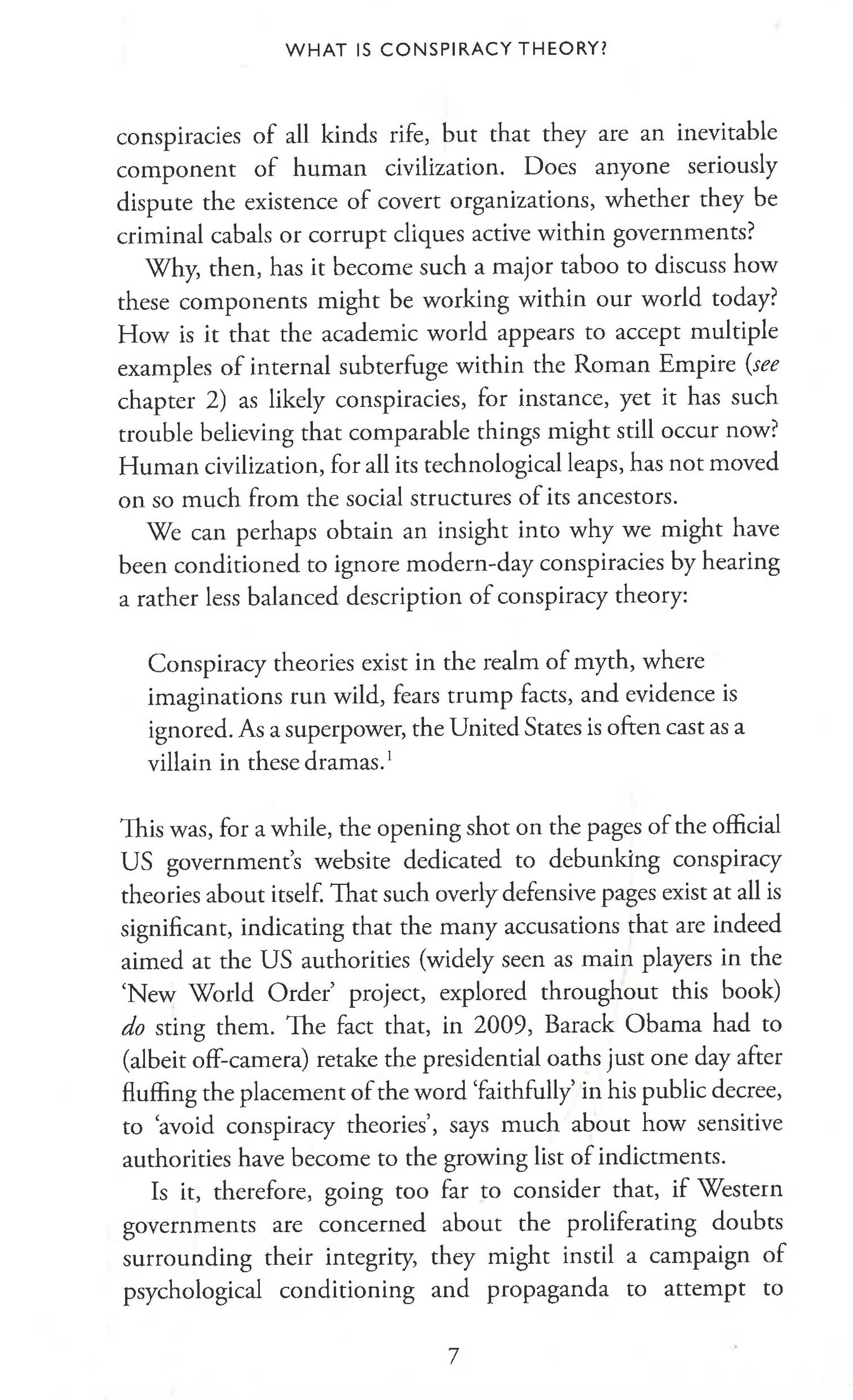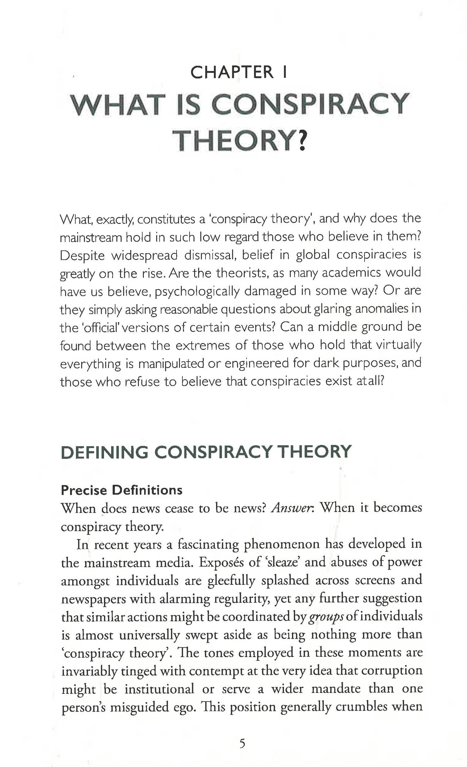 The author opens the conspiracy casebook by examining the mindset of those who believe in conspiracies, and considers whether the dismissive attitude towards them has been fair. Part Two looks into history to establish that conspiracies do occur, credibility should therefore be given to belief in some of the alleged plots and cover-ups of today.