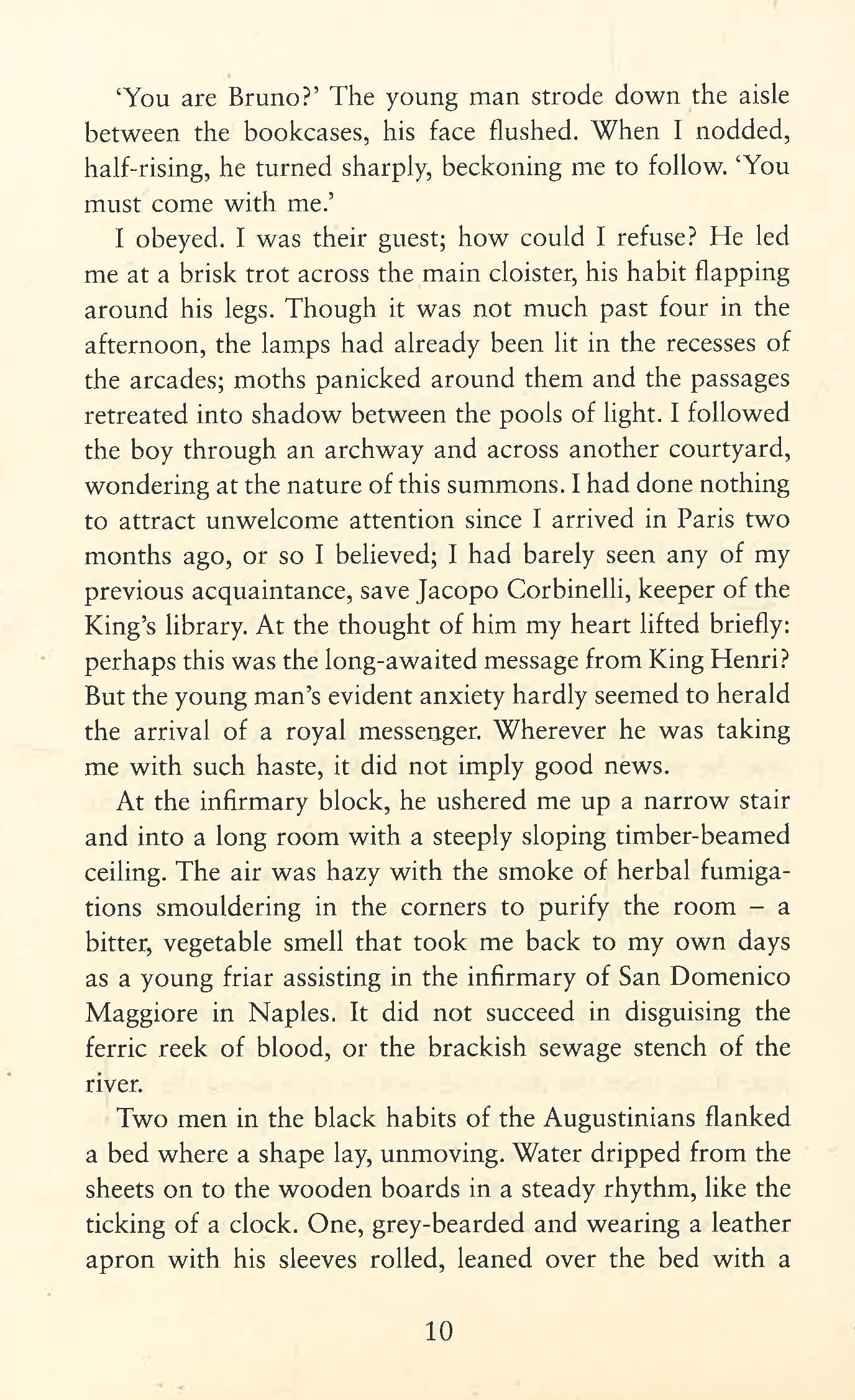 Heretic-turned-spy Giordano Bruno arrives in Paris to find a city on the edge of catastrophe. King Henri III lives in fear of a coup by the Duke of Guise and his fanatical Catholic League, and another massacre on the streets.