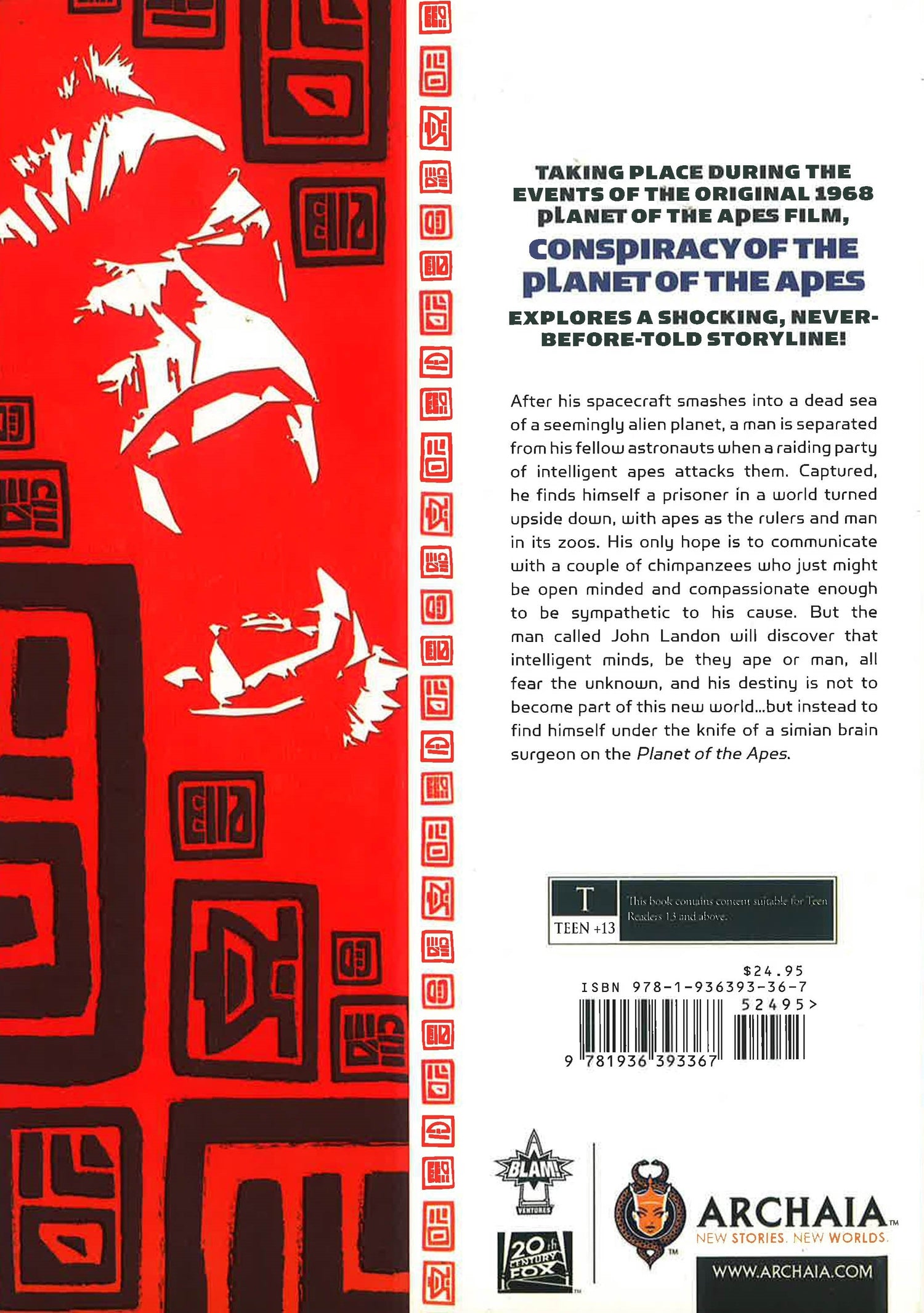 Archaia's first illustrated novel! Set during the classic 1968 Planet of the Apes film, "Conspiracy of the Planet of the Apes" tells the story of what happened between the scenes and centers on the astronaut John Landon, Gorilla police chief Marcus, and Chimpanzee scientist Dr. Milo. It features over 50 illustrations from various top talents in the industry, including full-color paintings by Jim Steranko, Joe Jusko, Dave Dorman, Barron Storey, Sanjulian, and Mark Texeira, starship designs by Andrew Probert, character portraits by Matt Busch.