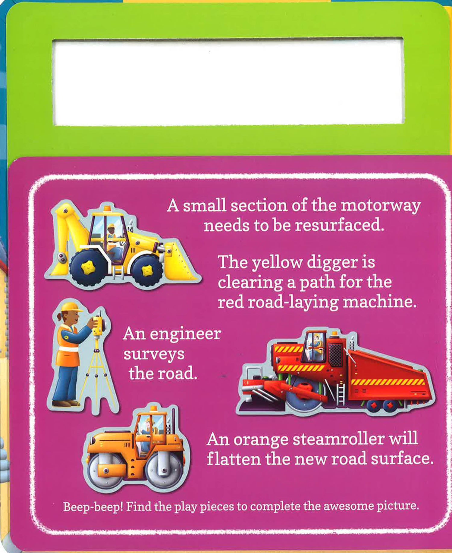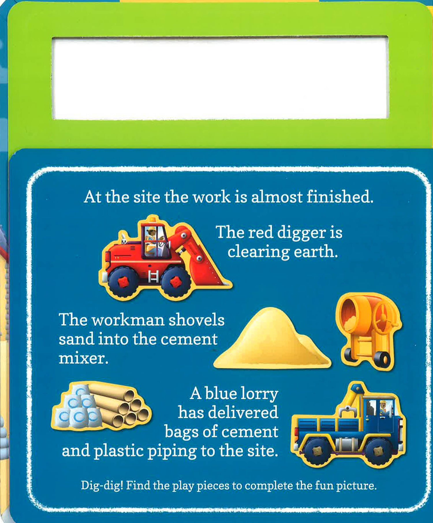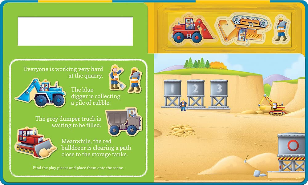 Children will love to complete every scene as they match the play pieces to the simple story. The reusable play pieces, including a digger, a dumper, and a bulldozer, cling securely to the pages and can be used time and time again. When play is over, place the play pieces back inside the secure compartment, ready for next time.