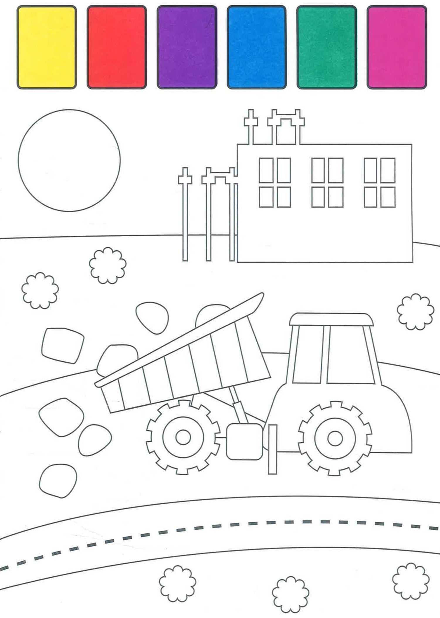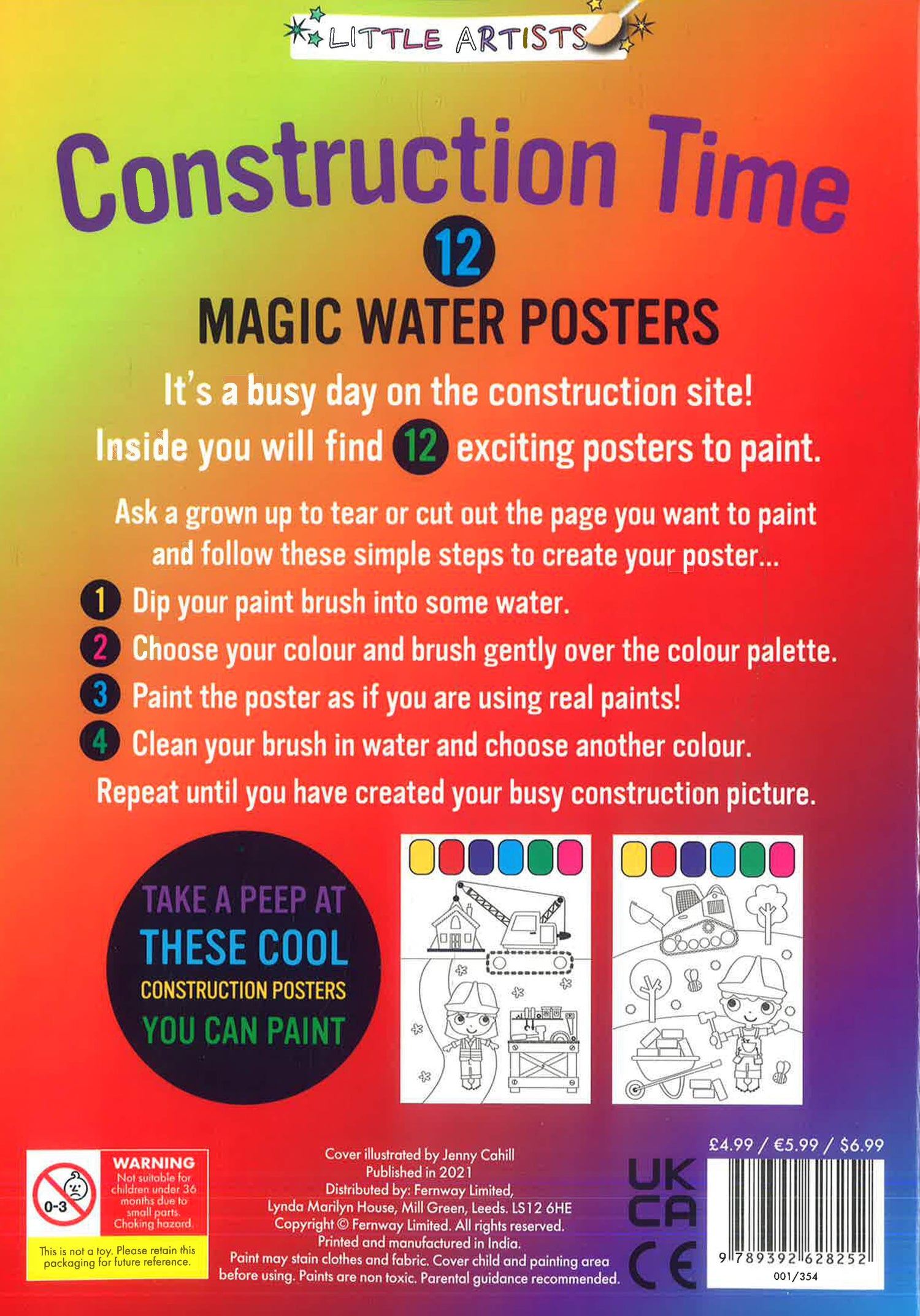 Its a busy day on the construction site Inside you will find 12 exciting posters to paint. Paint Palette on every page no mess Just add water