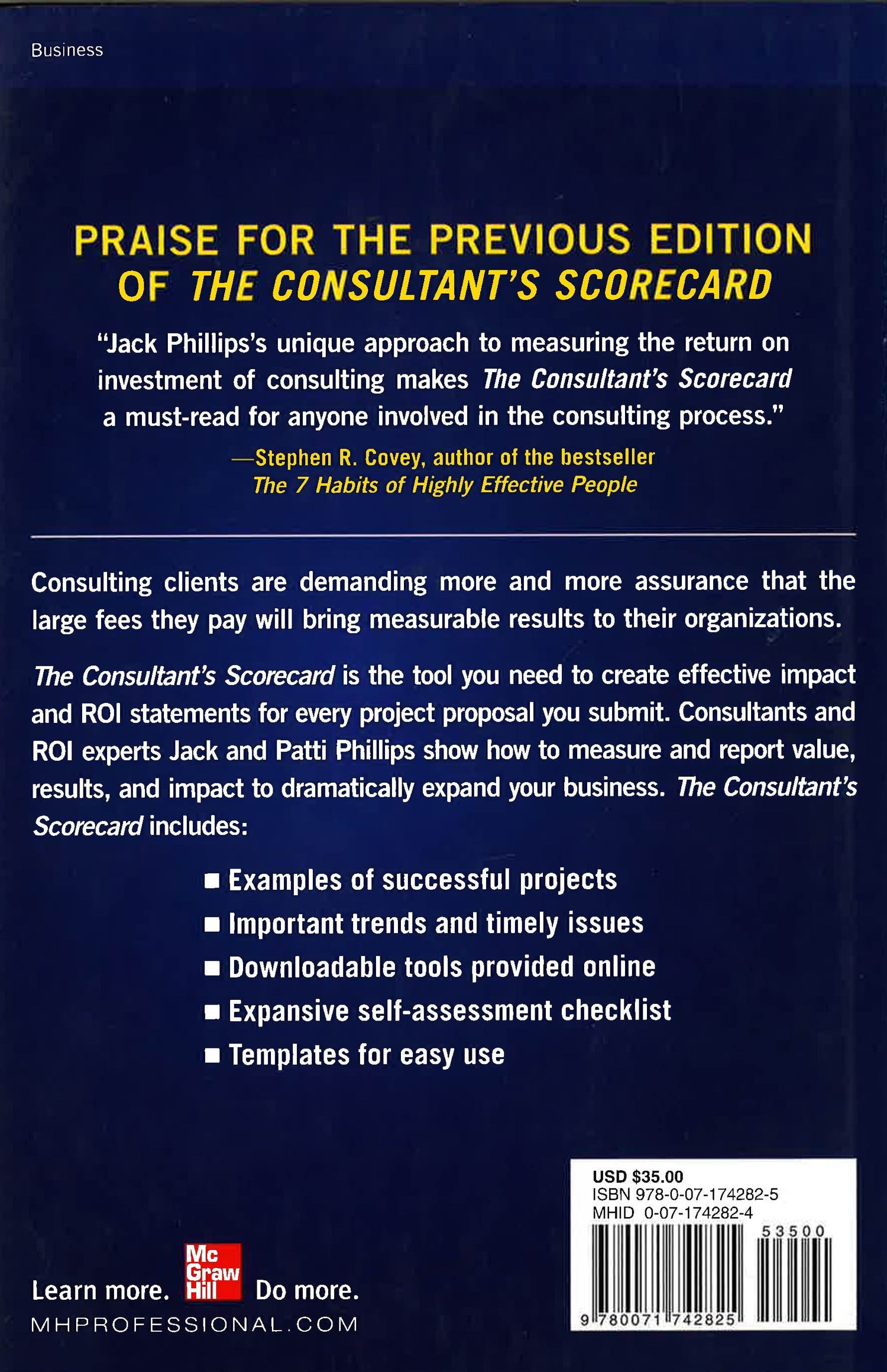 In addition to enabling you to measure your contribution, this process provides a framework you can use to focus on results throughout the consulting intervention.The key concept in any consulting project today is "accountability." Senior managers are being held more and more accountable for the consulting fees they pay out--so they're requiring more accountability from consultants. The Consultant's Scorecard helps both parties involved in the process form rocksolid measurements of the value of any project.PRAISE FOR THE PREVIOUS EDITION OF THE CONSULTANT'S SCORECARD:"Jack Phillips's unique approach to measuring the return on investment of consulting makes The Consultant's Scorecard a must-read for anyone involved in the consulting process." -- Stephen R. Covey, author of the bestseller The 7 Habits of Highly Effective PeopleConsulting clients are demanding more and more assurance that the large fees they pay will bring measurable results to their organizations. The Consultant's Scorecard is the tool you need to create effective impact and ROI statements for every project proposal you submit. Consultants and ROI experts Jack and Patti Phillips show how to measure and report value,results, and impact to dramatically expand your business. The Consultant's Scorecard includes: