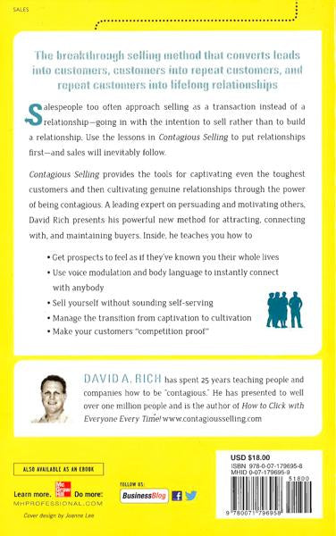 The breakthrough selling method that converts leadsinto customers, customers into repeat customers, andrepeat customers into lifelong relationshipsSalespeople too often approach selling as a transaction instead of a relationship--going in with the intention to sell rather than to build a relationship. Use the lessons in Contagious Selling to put relationships first--and sales will inevitably follow.Contagious Selling provides the tools for captivating even the toughest customers and then cultivating genuine relationships through the power of being contagious. A leading expert on persuading and motivating others, David Rich presents his powerful new method for attracting, connecting with, and maintaining buyers. Inside, he teaches you how toGet prospects to feel as if they've known you their whole livesUse voice modulation and body language to instantly connect with anybodySell yourself without sounding self-servingManage the transition from captivation to cultivationMake your customers "competition proof"