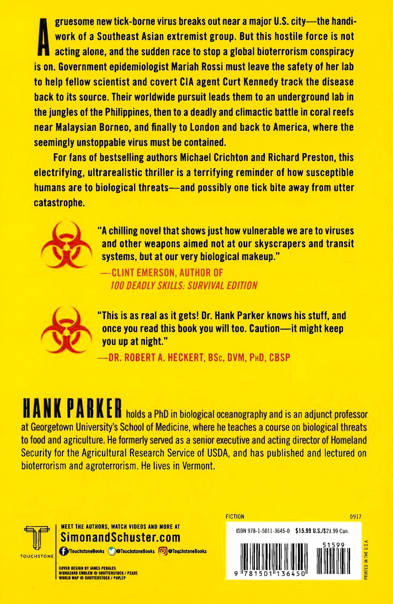 From Hank Parker, a former Homeland Security advisor specializing in bio- and agro-terrorism, comes a chillingly realistic debut thriller about a global plot to release a deadly virus and the elite response team who must try and stop it. It's a race against time to both find a vaccine and unravel a bio-terrorist conspiracy when a terrifying new tick-borne virus is traced to an extremist group in Southeast Asia. Government epidemiologist Mariah Rossi must leave the safety of her lab behind to help CIA agent Curt Kennedy track the disease to its source. Their harrowing journey from one hot zone to another takes them from the jungles of the Philippines to the coral reefs near Malaysian Borneo, then back to the United States where martial law has been declared to keep the deadly disease contained. For fans of Michael Crichton and Richard Preston, this "is a true thriller with non-stop action and a terrifyingly realistic look at what could happen if terrorists were able to release a virus in America" (Scott McEwen, author of American Sniper).