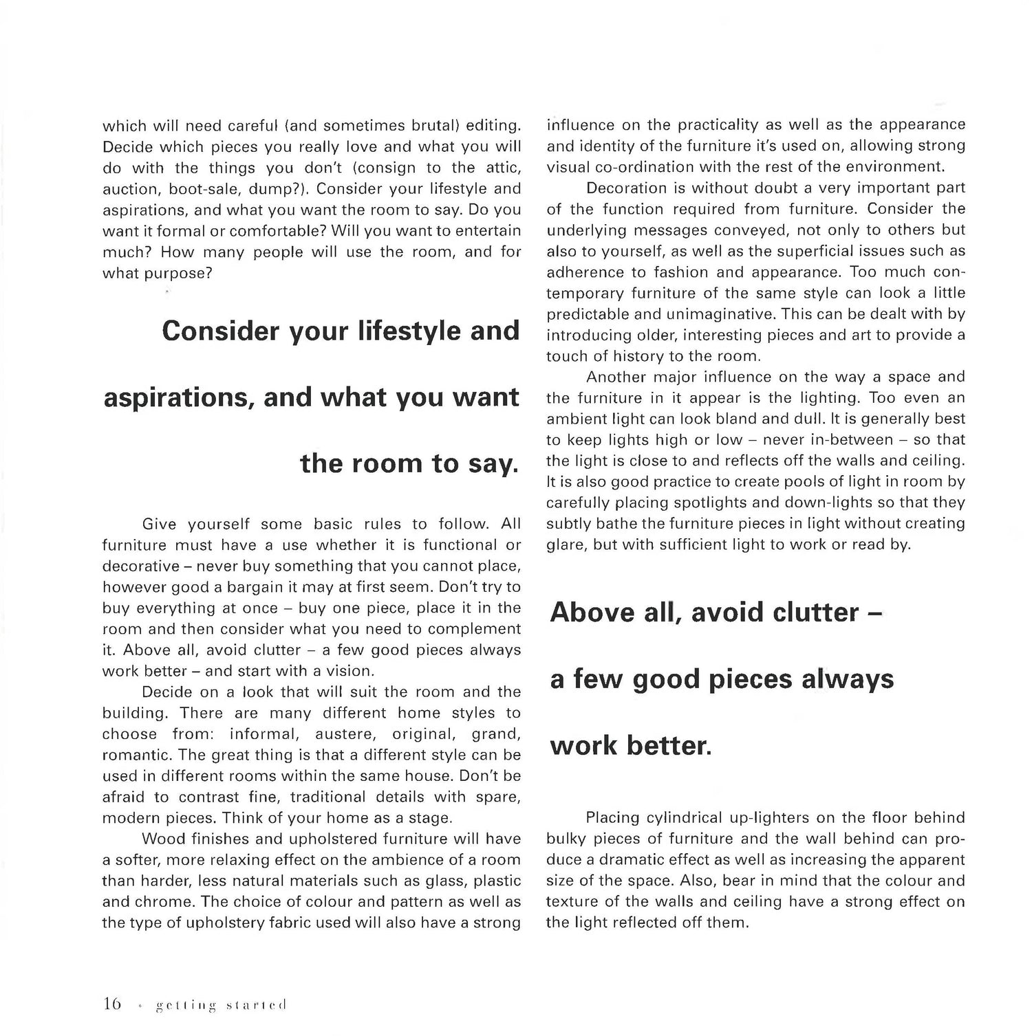Your choice of furniture and the way you use and arrange it is what transforms a house into a home. But while much has been written about the classic furniture of the past, it can be harder to identify those qualities that make a modern piece of furniture classic or collectible. Demystifying contemporary furniture, "Furniture" begins by looking at new manufacturing methods and the latest materials, explaining how furniture is made today. Then, taking you through the home room by room, it shows materials to create stylish yet supremely functional furniture, and offering advice on selecting pieces from the sometimes bewildering range now available. The last chapter shows how to pull together separate pieces to furnish a complete room, demonstrating how to mix and match your furniture to create the effect you desire. "Furniture" arms you with the knowledge to make an informed choice, enabling you to select today's pieces that are tomorrow's collectibles.