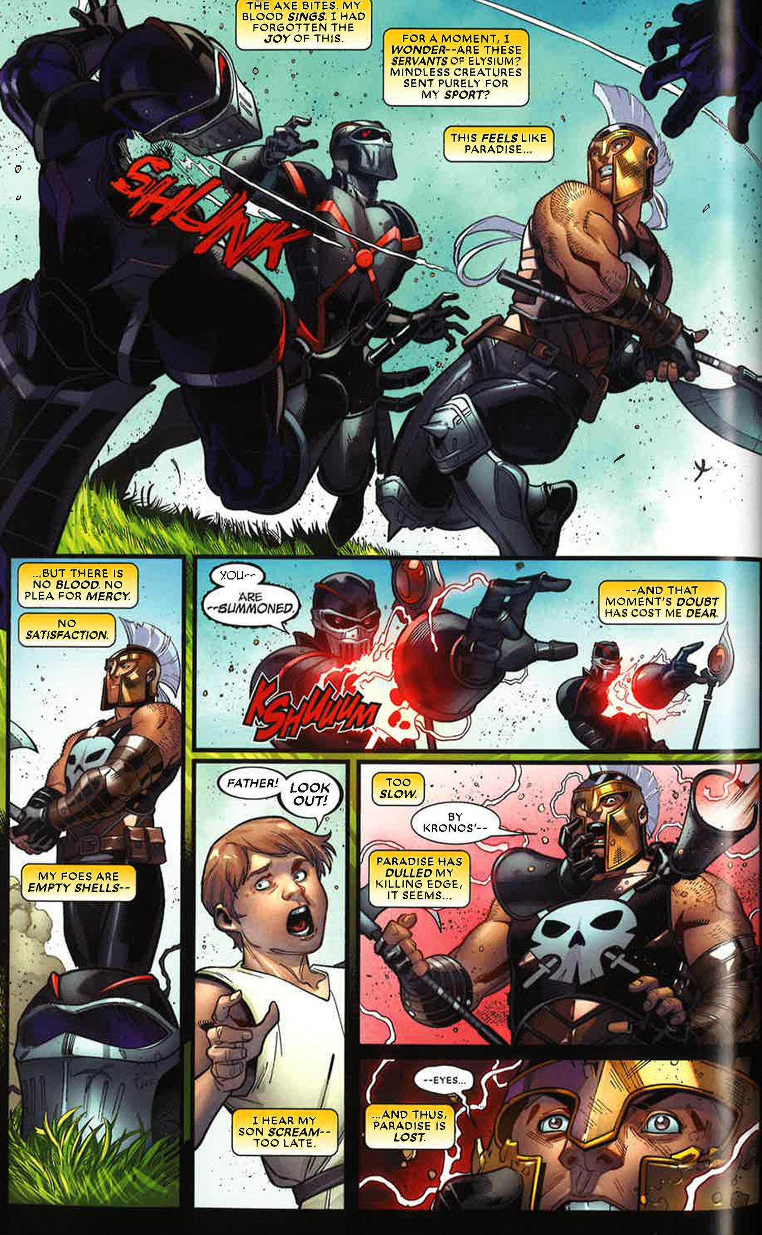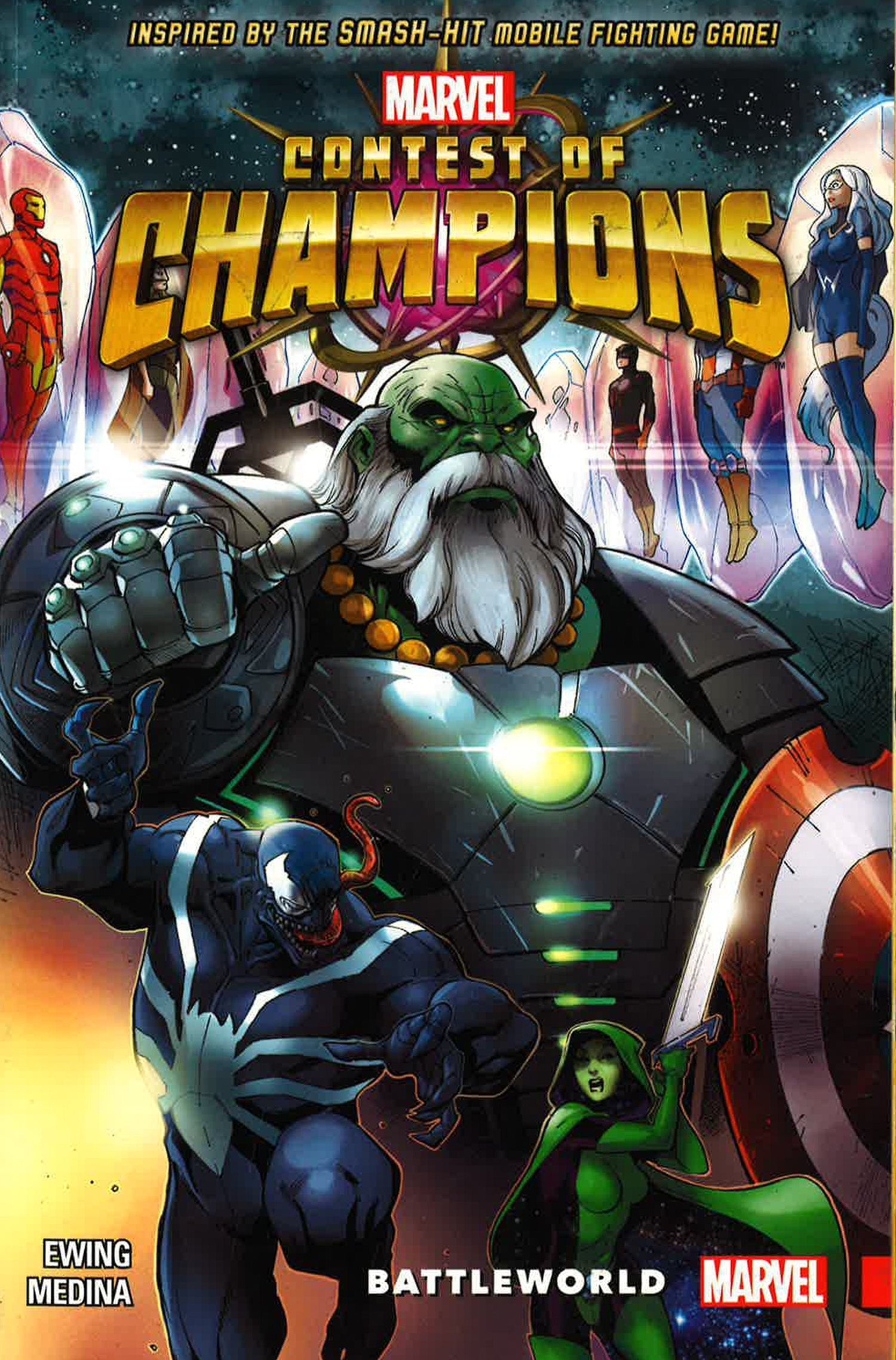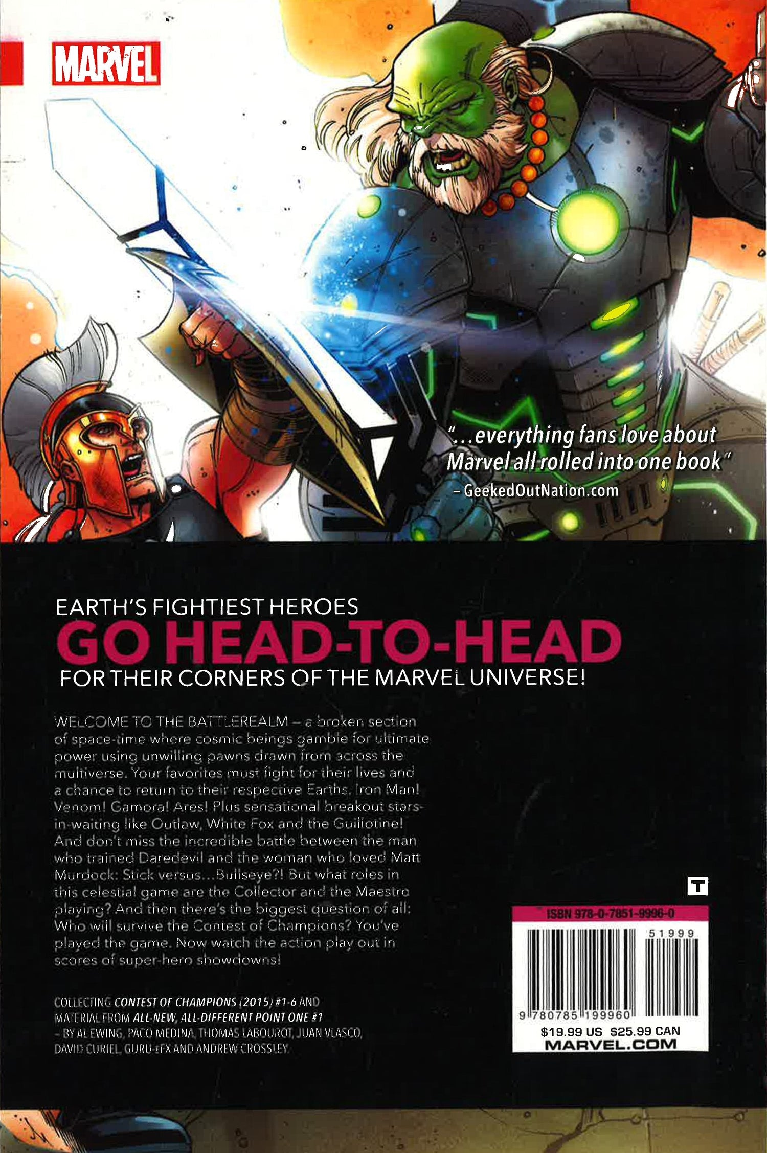 You've played the game, now watch the action play out across page after page of super hero showdowns! Welcome to the Battlerealm - a broken section of space-time where cosmic beings gamble for ultimate power using unwilling pawns drawn from across the multiverse. Your favorites must fight for their lives and a chance to return to their Earth. Iron Man! Venom! Gamora! Ares! Plus sensational breakout stars-in-waiting like Outlaw, White Fox and the Guillotines! And don't miss the incredible battle between the man who trained Daredevil and the woman who loved Matt Murdock: Stick versus... Bullseye?! But what roles in this celestial game are the Collector and the Maestro playing? And, the biggest question of all - who will survive the Contest of Champions?