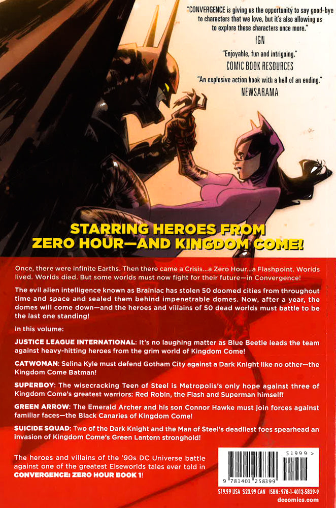A CONVERGENCE tie-in graphic novel, starring heroes from ZERO HOUR and KINGDOM COME!Once, there were infinite Earths. Then there came a Crisis . . . a Zero Hour . . . a Flashpoint. Worlds lived. Worlds died. But some worlds must now fight for their future - in the Convergence!The evil alien intelligence known as Brainiac has stolen 50 doomed cities from throughout time and space and sealed them behind impenetrable domes. Now, after a year, the domes will come down - and the heroes and villains of 50 dead worlds must battle to be the last one standing!In this volume:JUSTICE LEAGUE INTERNATIONAL: It?s no laughing matter as Blue Beetle and Booster Gold lead the team against heavy-hitting heroes from the grim world of Kingdom Come!CATWOMAN: Selina Kyle must defend Gotham City against a Dark Knight like no other?the Kingdom Come Batman!SUPERBOY: The wisecracking Teen of Steel is Metropolis?s only hope against three of Kingdom Come?s greatest warriors: Red Robin, The Flash and Superman himself!GREEN ARROW: The Emerald Archer and his son Connor Hawke must join forces against familiar faces?the Black Canaries of Kingdom Come!SUICIDE SQUAD: Bane and Cyborg Superman, two of the Dark Knight and the Man of Steel?s deadliest foes, spearhead an invasion of Kingdom Come?s Green Lantern stronghold!The heroes and villains of ?90s DC Universe battle against one of the greatest Elseworlds tales ever told in CONVERGENCE: ZERO HOUR VOL. 1!