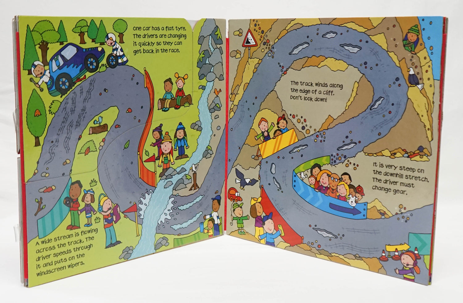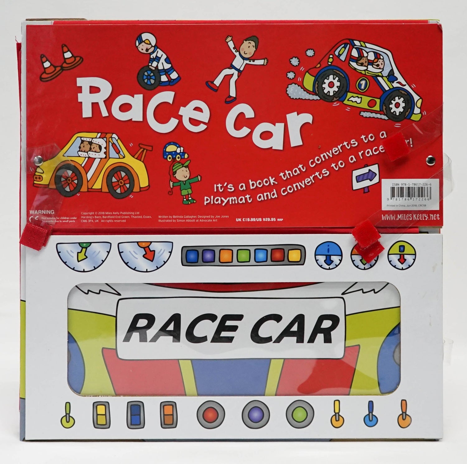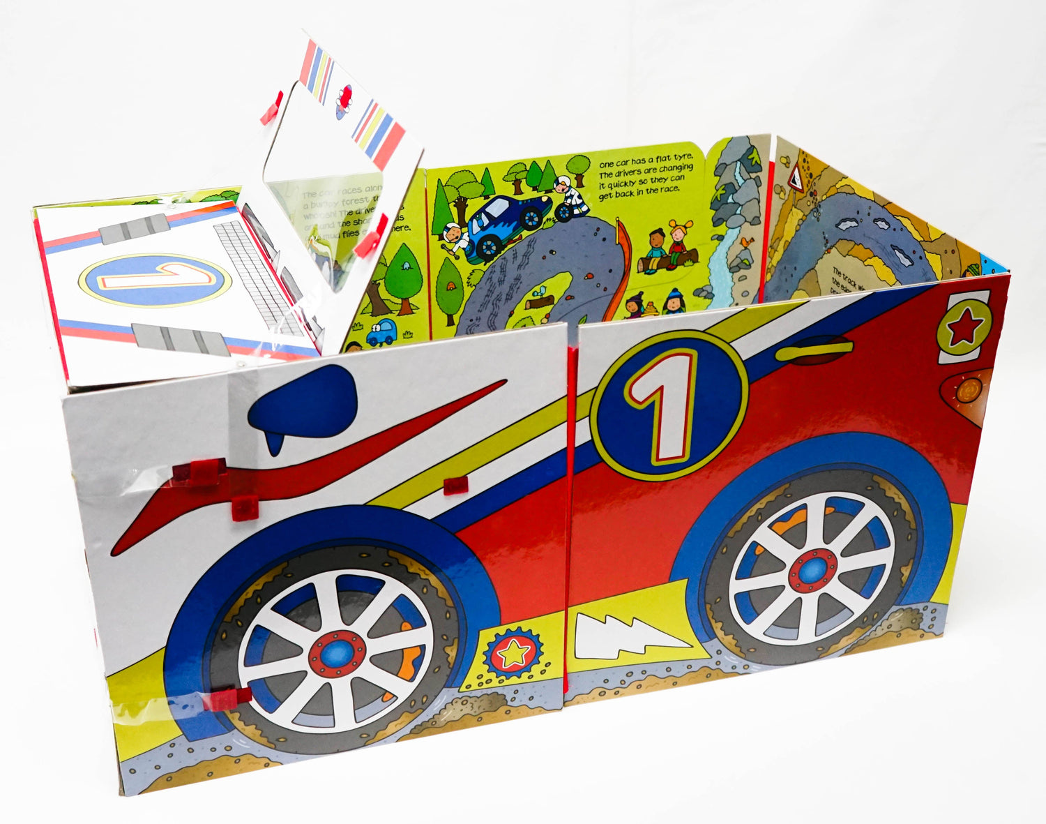 This Convertible is a fun storybook, playmat and a sit-in vehicle for toddlers. Once unfolded, parent and child can read the text, which describes an action-packed rally race. Laid on the floor, the book can also be used as a playmat. The boards can then be refolded into a large, sturdy race car that a child can sit in and pretend to to drive.