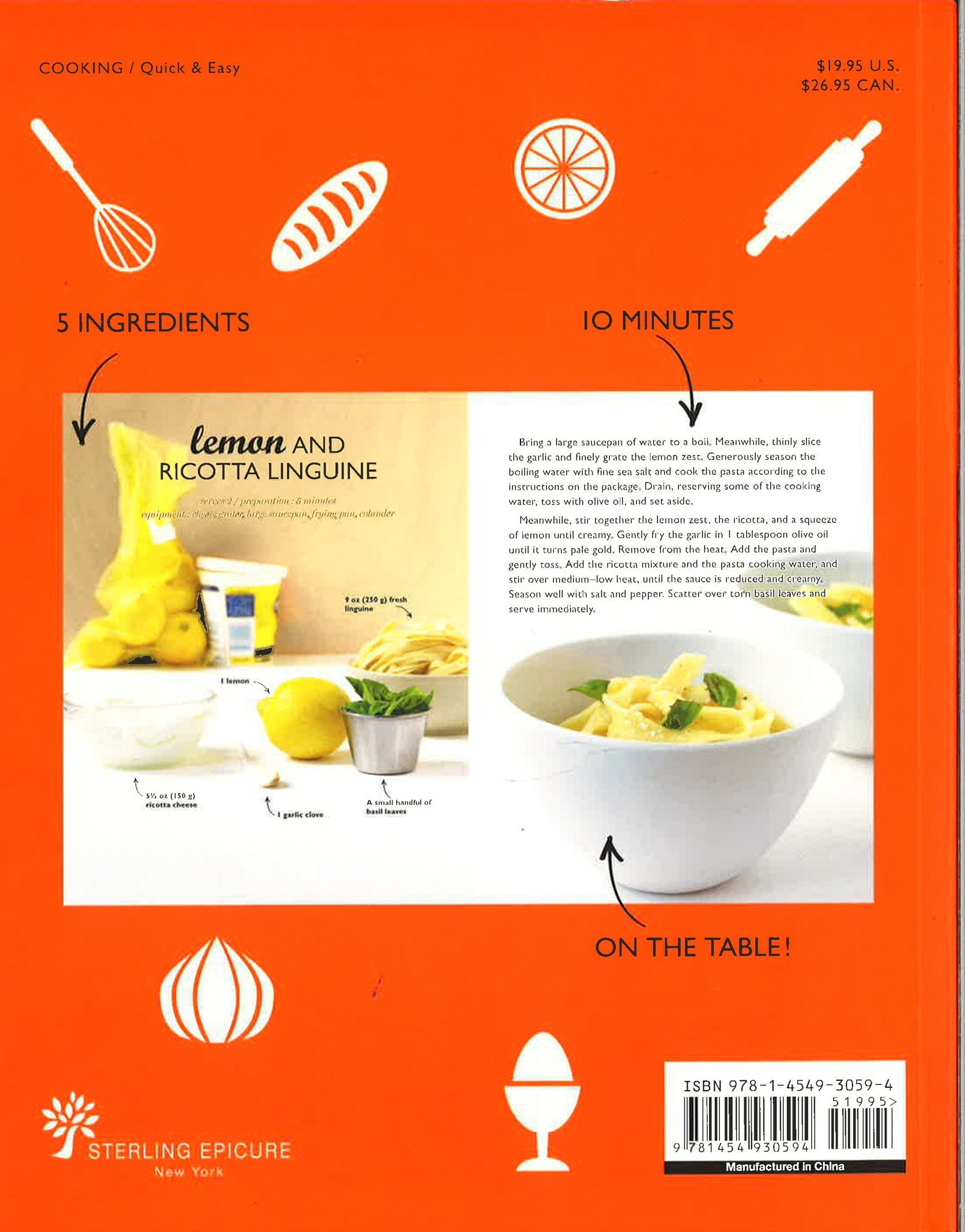 Bring healthy, mouthwatering food to the table . . . in just 10 MINUTES! This is delicious, nutritious cooking made easy! Created by an award-winning cookbook author, each recipe--from hearty pasta, meat, poultry, and seafood dishes to light bites, dips, salads, soups, and desserts--uses only five ingredients and takes a mere 10 minutes from preparation to plate. Who knew how quickly you could cook a luscious dinner of Fettuccine Alfredo (with variations that include mushrooms, bacon and peas, smoked salmon, and spinach) or a lunch of Vietnamese Duck Rolls? No need to forget dessert, either, when it's a breeze to make, like Chocolate Cake in a Mug or Mojito Granita! With lists of pantry staples to have on hand, along with short, crystal-clear directions and stunning photos of all the ingredients used in the recipes, you'll discover how effortless it can be to put great food on the table fast!