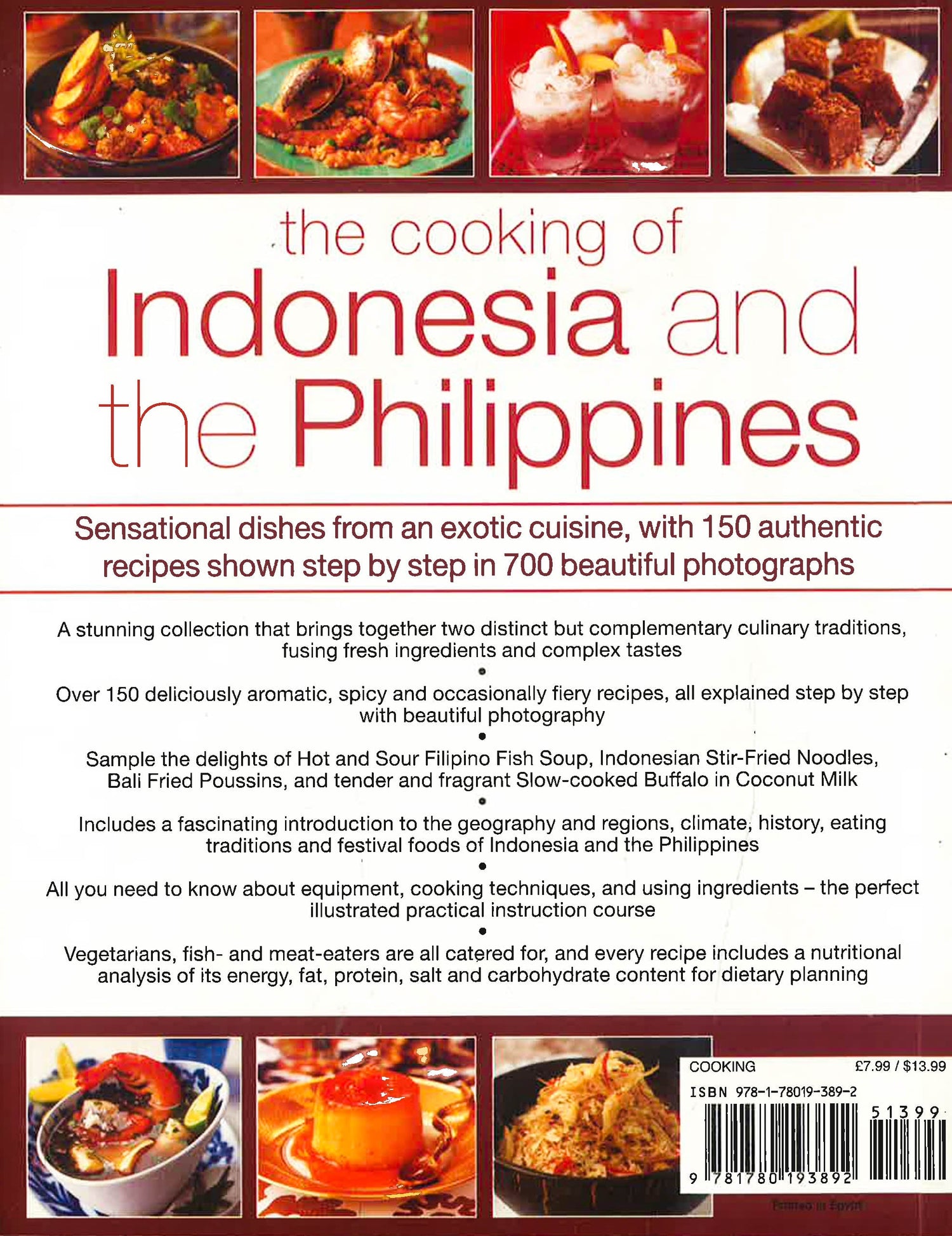This book features sensational dishes from an exotic cuisine, with 150 authentic recipes shown step by step in 750 beautiful photographs. It includes deliciously aromatic, spicy and occasionally fiery recipes, such as Hot and Sour Filipino Fish Soup, Indonesian Stir-Fried Noodles, Bali Fried Poussins, and tender and fragrant Slow-cooked Buffalo in Coconut Milk. It offers all you need to know about equipment, cooking techniques, and using ingredients - the perfect illustrated practical instruction course. Indonesia and the archipelago that forms the Philippines border each other, yet have nurtured distinct culinary traditions. Indonesian cuisine has a reliance on fragrant herbs and spices, while in the Philippines the Spanish influence is more evident. The many exciting recipes in this book include Sardines Cooked in Spicy Coconut Milk with Herbs, Colonial Rice Soup with Pork, Filipino Paella, and Adobo, as well as sweet drinks and desserts based on local fruits and coconuts. This fabulous collection of dishes from exotic Indonesia and the sun-soaked Philippines is illustrated with 750 evocative photographs and is guaranteed to delight your tastebuds.