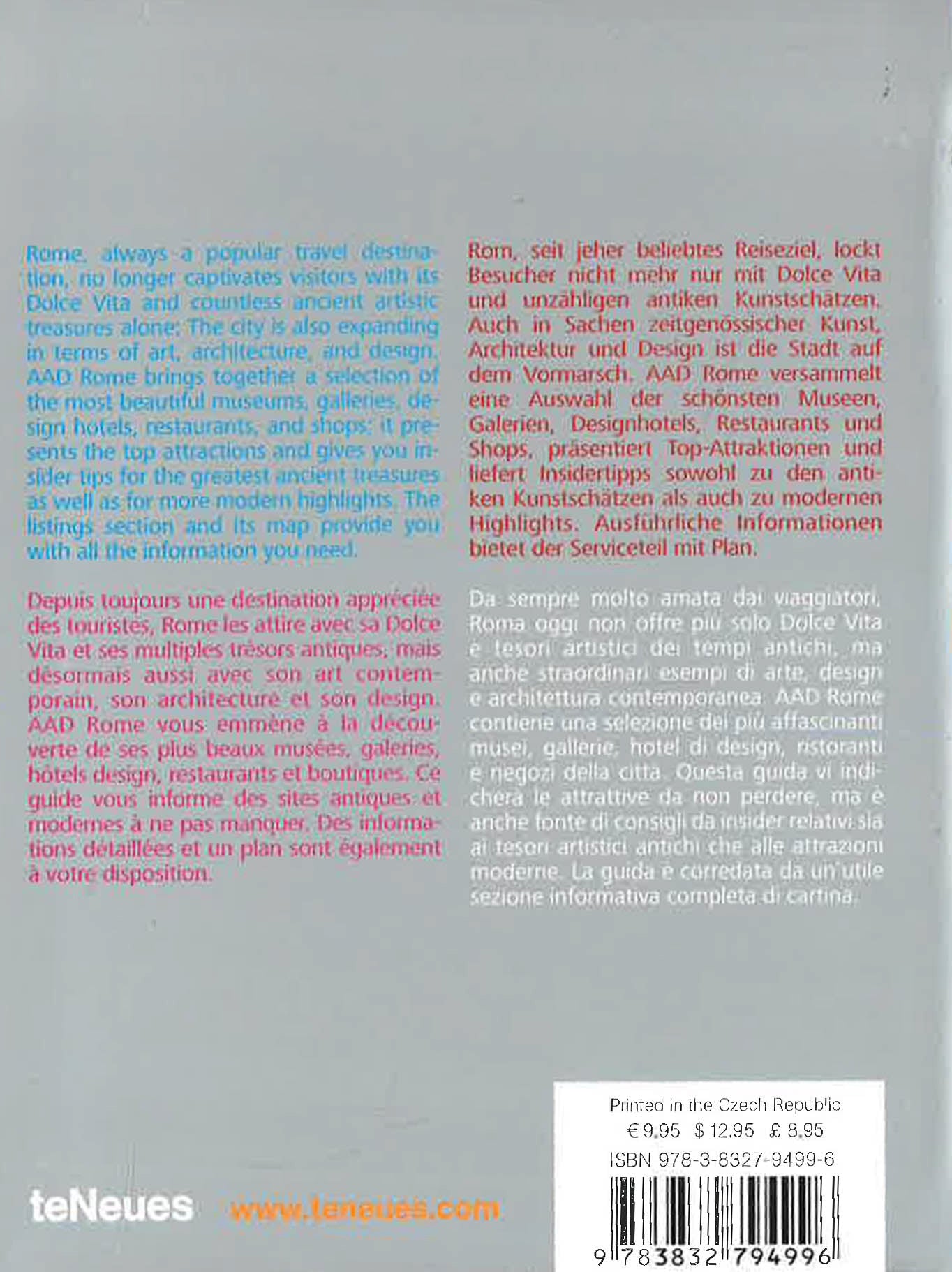 A destination for centuries, Rome offers all you could desire for art, architecture and design. From its age-old buildings to newer art and architecture, the Roman spirit is everywhere you look. AAD Rome selects the finest museums, buildings and, of course cutting-edge art treasures. Outstanding contemporary architecture like Zaha Hadid's MAXXI Museum beautifully complement Rome's ancient legacy. So, whether you're familiar with Rome's marvels or if it's your first visit, this guide highlights top attractions as well as many hidden wonders. SELLING POINTS: An extensive overview for both residents and visitors with contemporary highlights not included in other guidebooks The convenient service section includes a concise overview of transport, events, and other useful traveler resources ILLUSTRATIONS: 200 colour photographs