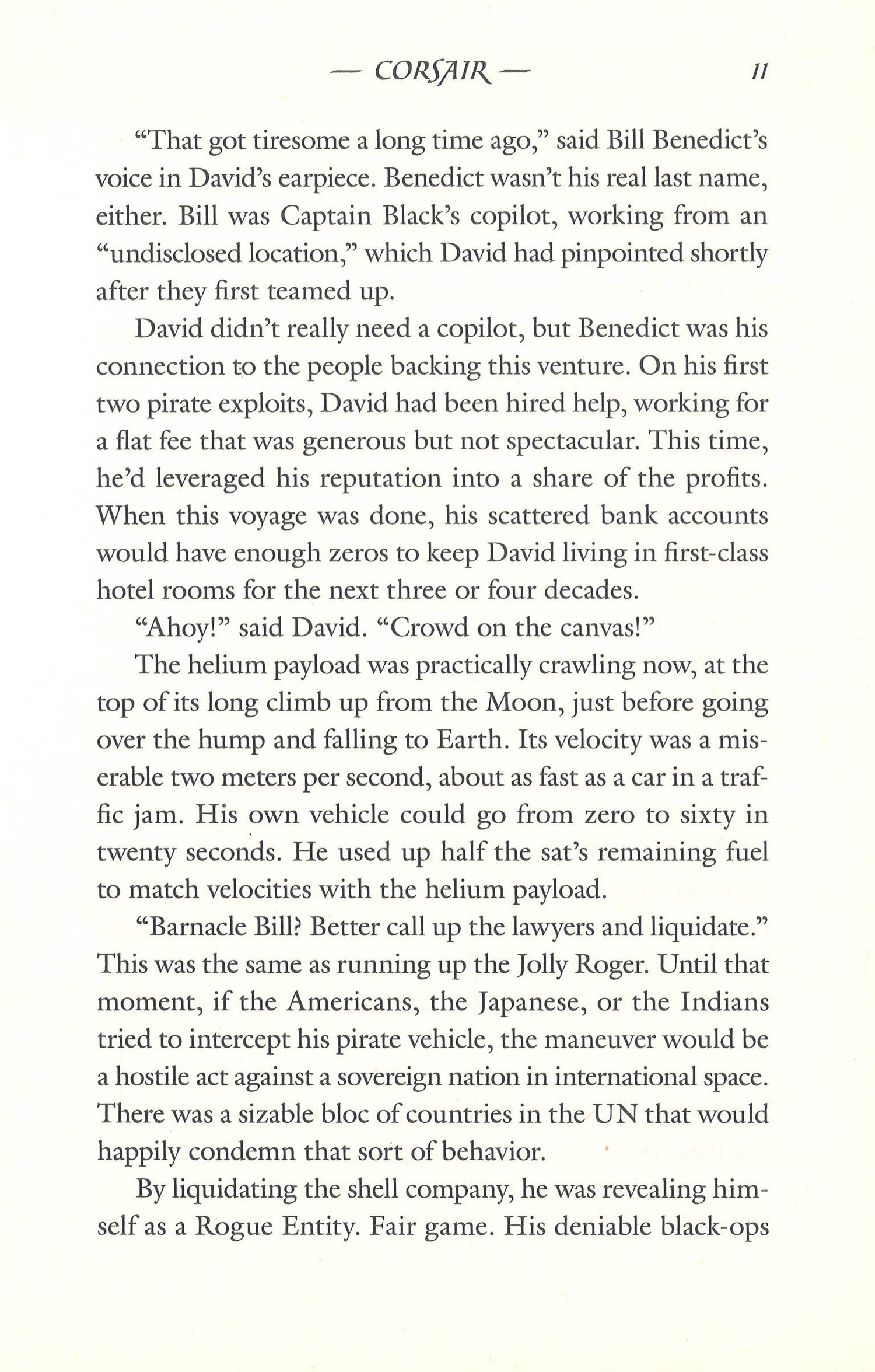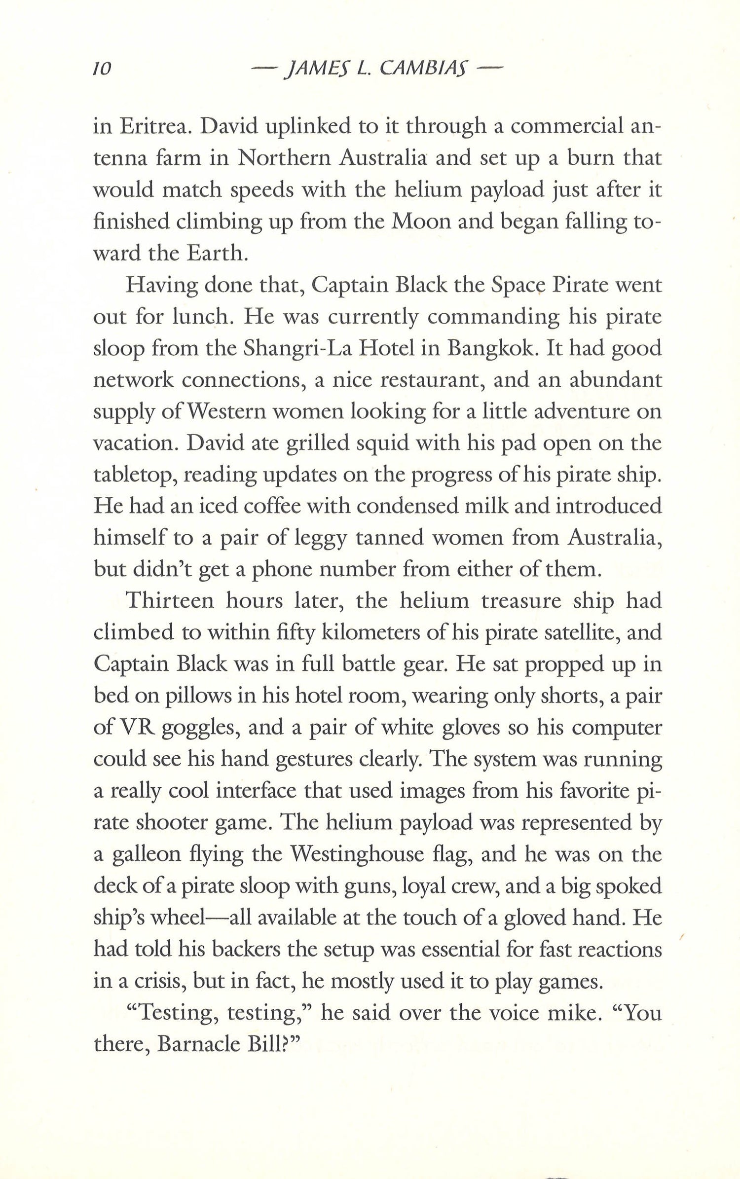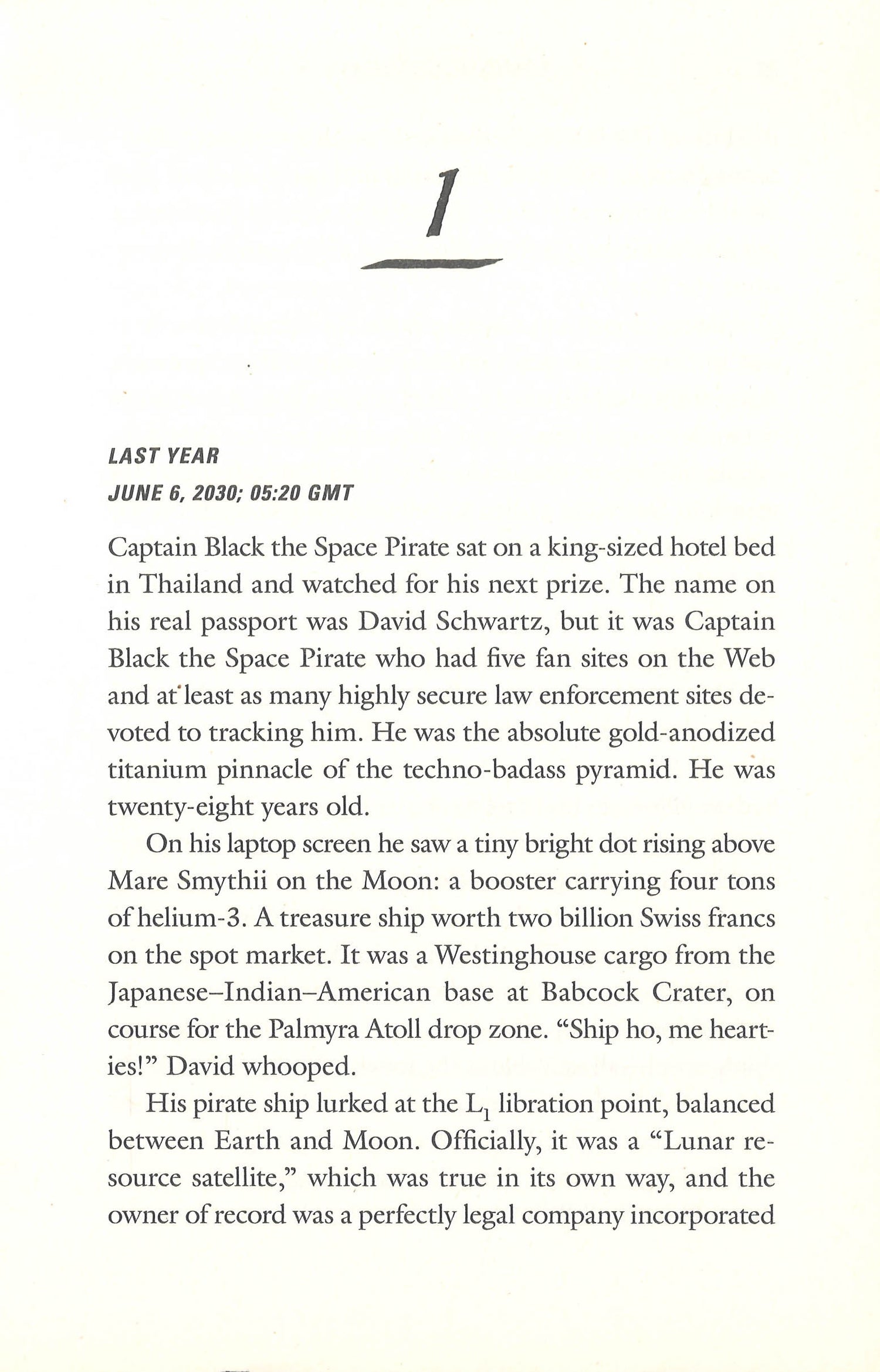 In the early 2020s, two young, genius computer hackers, Elizabeth Santiago and David Schwartz, meet at MIT, where Schwartz is sneaking into classes, and have a brief affair. David is amoral and out for himself, and soon disappears. Elizabeth dreams of technology and space travel and takes a military job after graduating. Nearly ten years later, David is setting himself to become a billionaire by working in the shadows under a multiplicity of names for international thieves, and Elizabeth works in intelligence preventing international space piracy. With robotic mining in space becoming a lucrative part of Earth's economy, shipments from space are dropped down the gravity well into the oceans. David and Elizabeth fight for dominance of the computer systems controlling ore drop placement in international waters. If David can nudge a shipment 500 miles off its target, his employers can get there first and claim it legally in the open sea. Each one intuits that the other is their real competition but can't prove it. And when Elizabeth loses a major shipment, she leaves government employ to work for a private space company to find a better way to protect shipments. But international piracy has very high stakes and some very evil players. And both Elizabeth and David end up in a world of trouble.