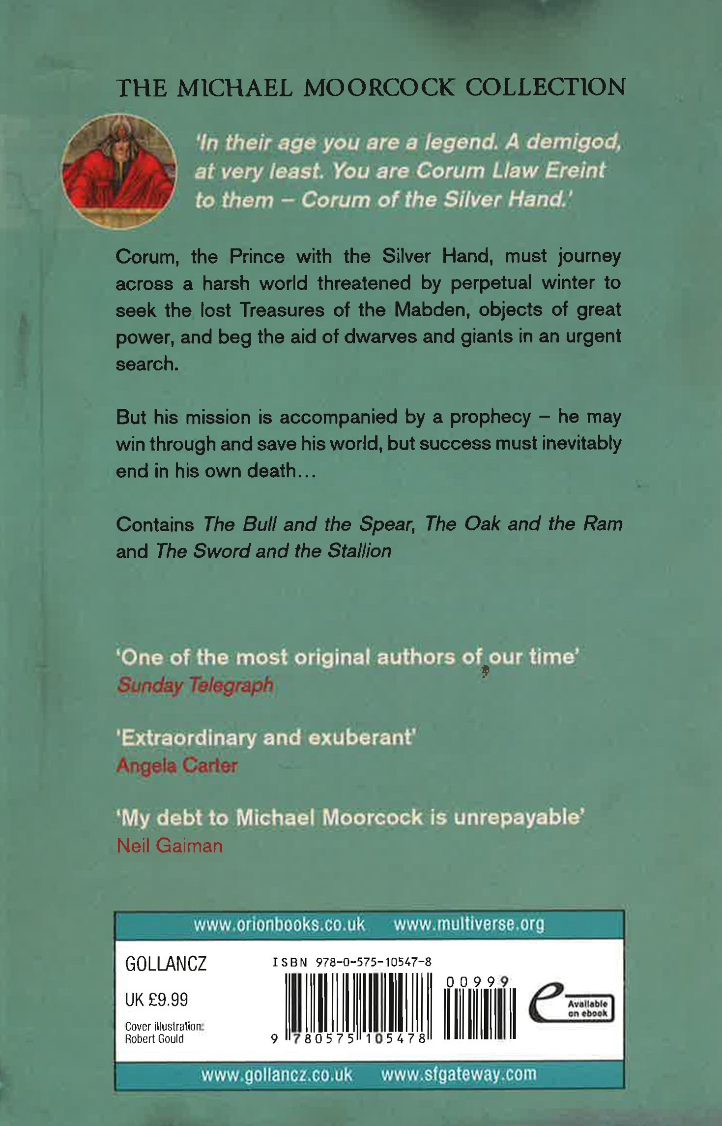 Prince Corum is the last of the Vadhagh, his family and people brutally slain by the Mabden. Vowing to wreak vengeance on the killers, Corum sets out on his terrible quest only to fall in love with a beautiful Mabden woman, and to confront the fury of the Lords of Chaos. For they fear that he is the hero who could tip the balance in their cataclysmic war with the forces of Law and free his world from Chaos's vicious grip. His epic struggle against them and his ultimate victory is only bought at a considerable price. Moorcock's evocation of a rich, dark world, a time of magic, phantasms, cities in the sky, oceans of light and wild flying beasts of bronze is one of the pinnacles of modern imaginative literature.